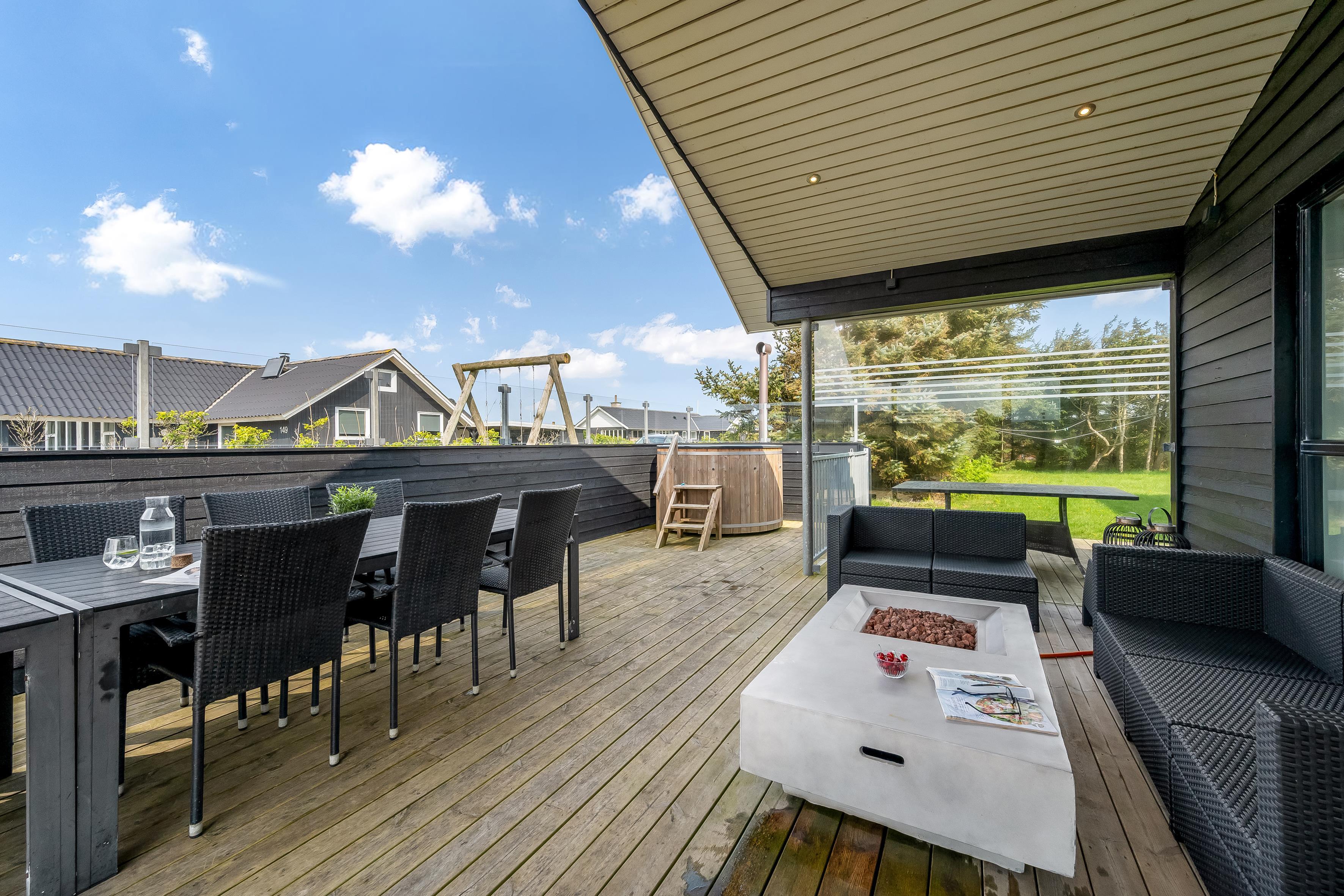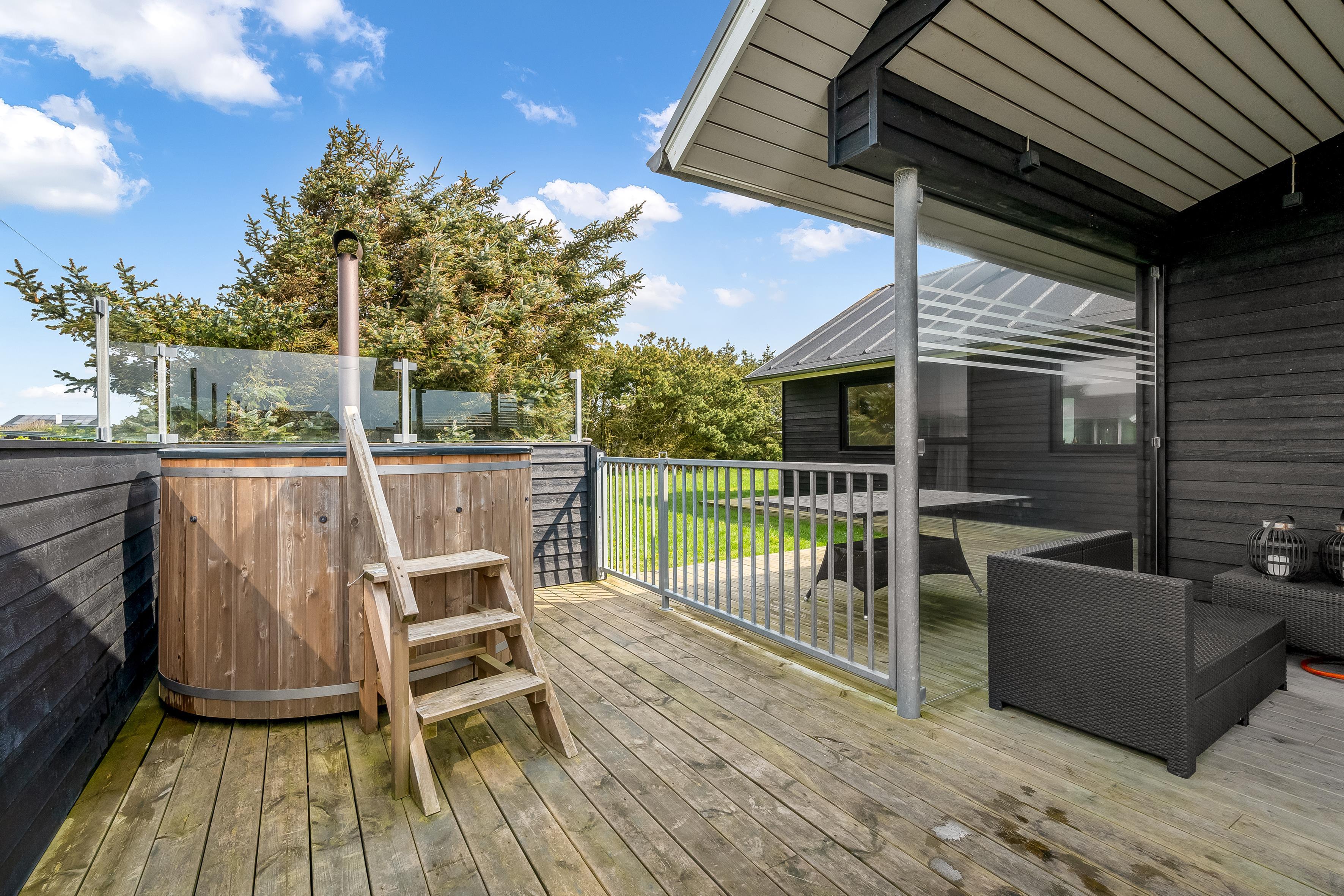 Die Terrasse beherbergt auch ein weiteres luxuriöses Highlight des Ferienhauses - neben der Wellness-Oase im Innenbereich mit Sauna und Whirlpool können Sie auch einen Whirlpool im Freien genießen.