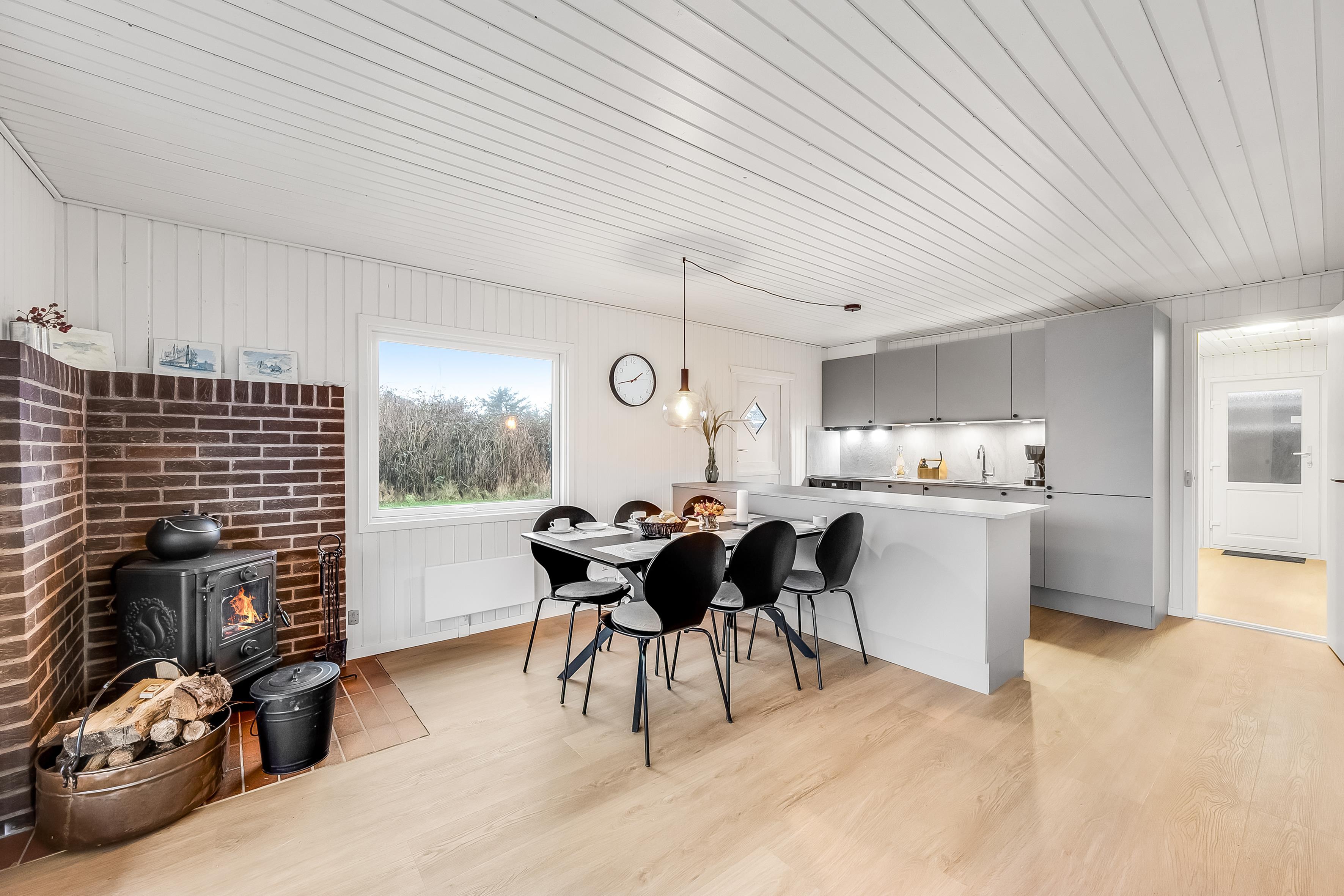Die helle und offene Küche ist voll ausgestattet mit modernen Geräten, wie Geschirrspüler, Backofen, Mikrowelle, Keramikkochfeldern und einem geräumigen Kühlschrank inklusive 40-Liter-Gefrierfach. Im direkt angrenzenden Essbereich befindet sich ein großer Tisch, an dem ihr gemeinsam Essen, interessante Gespräche führen oder lustige Spieleabende verbringen könnt. Eine besonders gemütliche Atmosphäre verschafft euch der Kamin, wenn die Flammen darin lodern und das trockene Holz knistert. Im Haus befindet sich ebenfalls eine kostengünstige und energieeffiziente Wärmepumpe, welche zur Einstellung der individuellen, euch angenehmen Temperatur beiträgt.