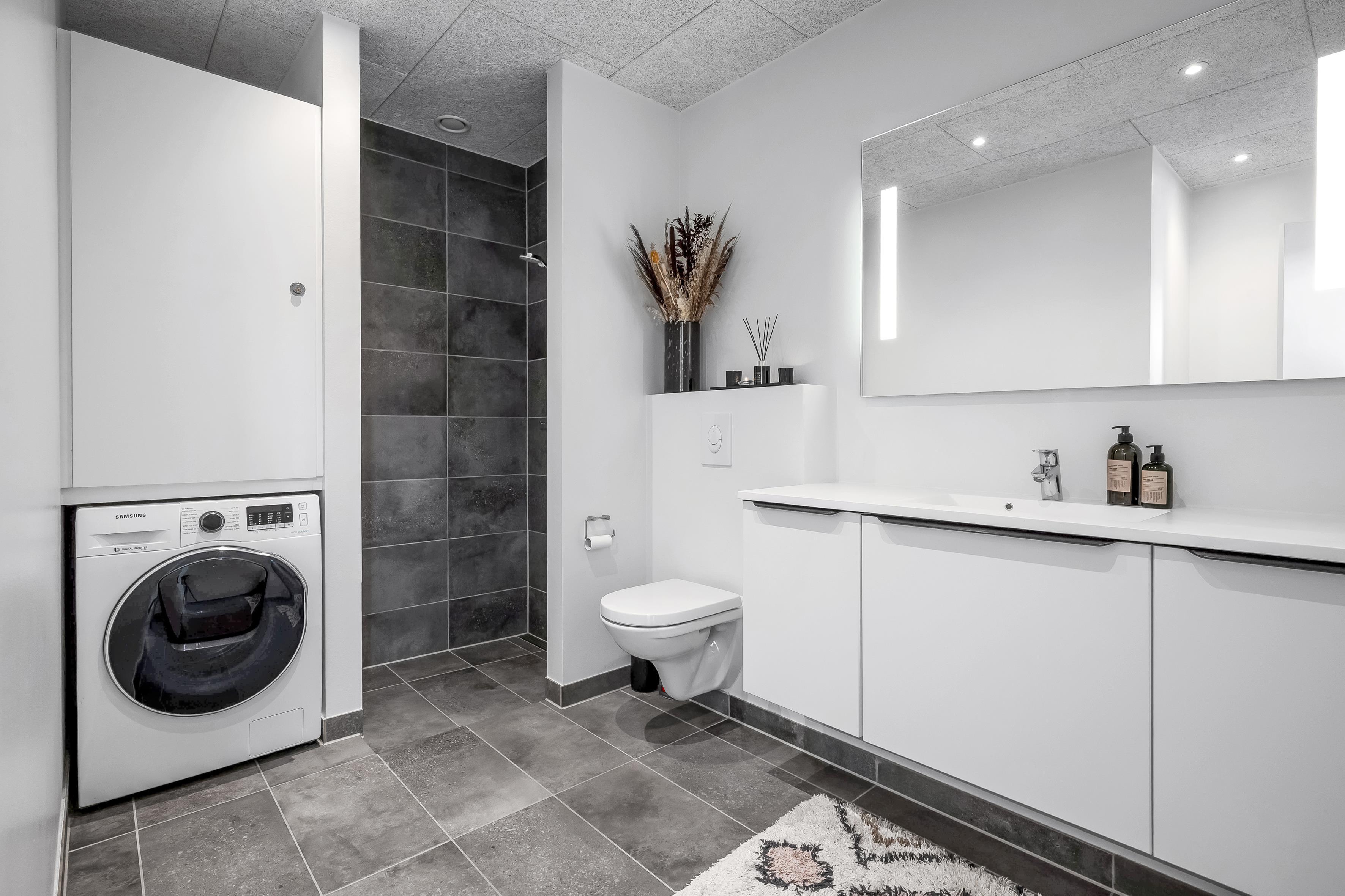 Das elegante, in weiß gehaltene Badezimmer mit Dusche, besticht zudem mit einem Spiegel, der sich über den gesamten Waschtisch zieht, welcher viel Stauraum bietet. Dort findet ihr auch die Waschmaschine die gleichzeitig auch als Trockner fungiert.