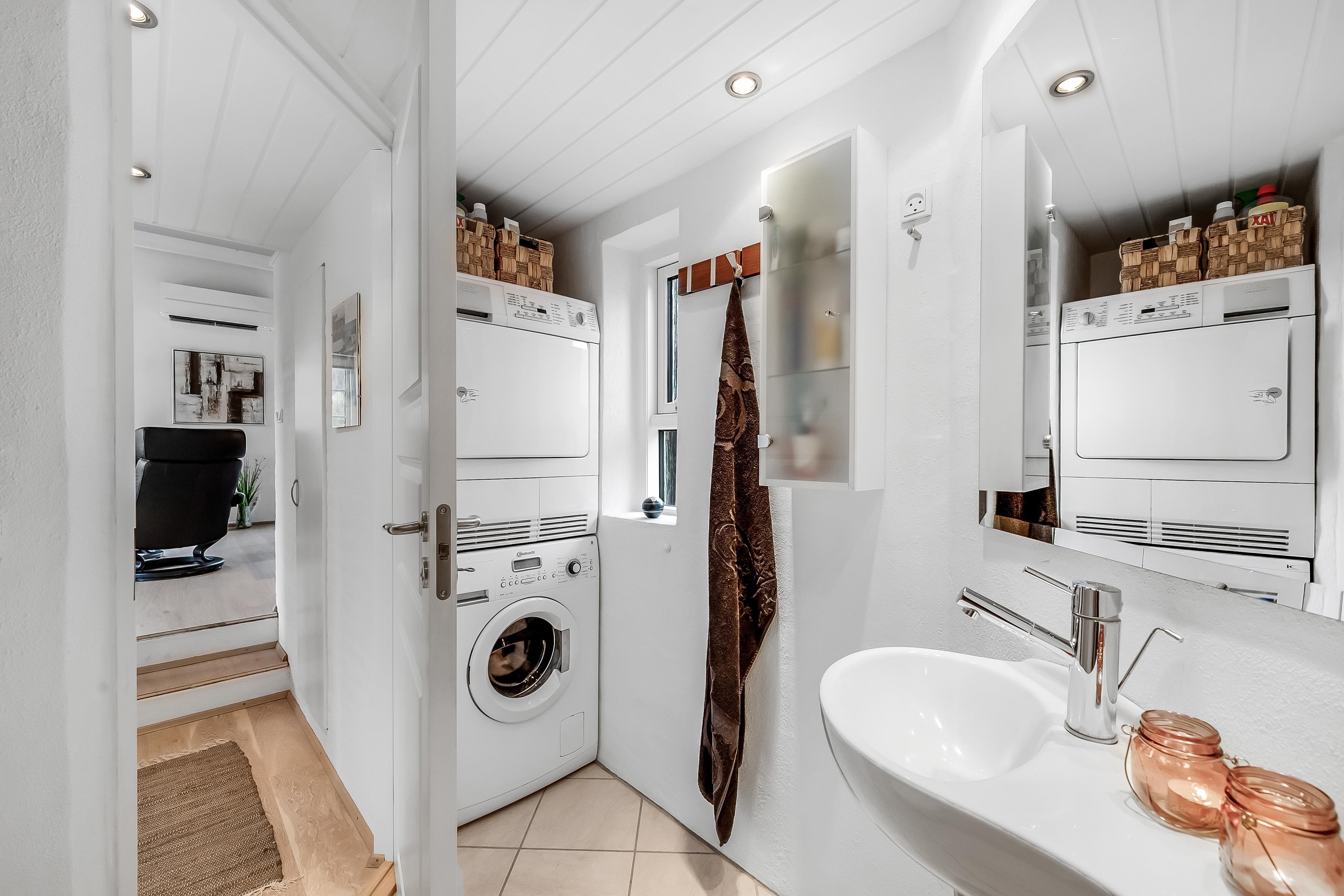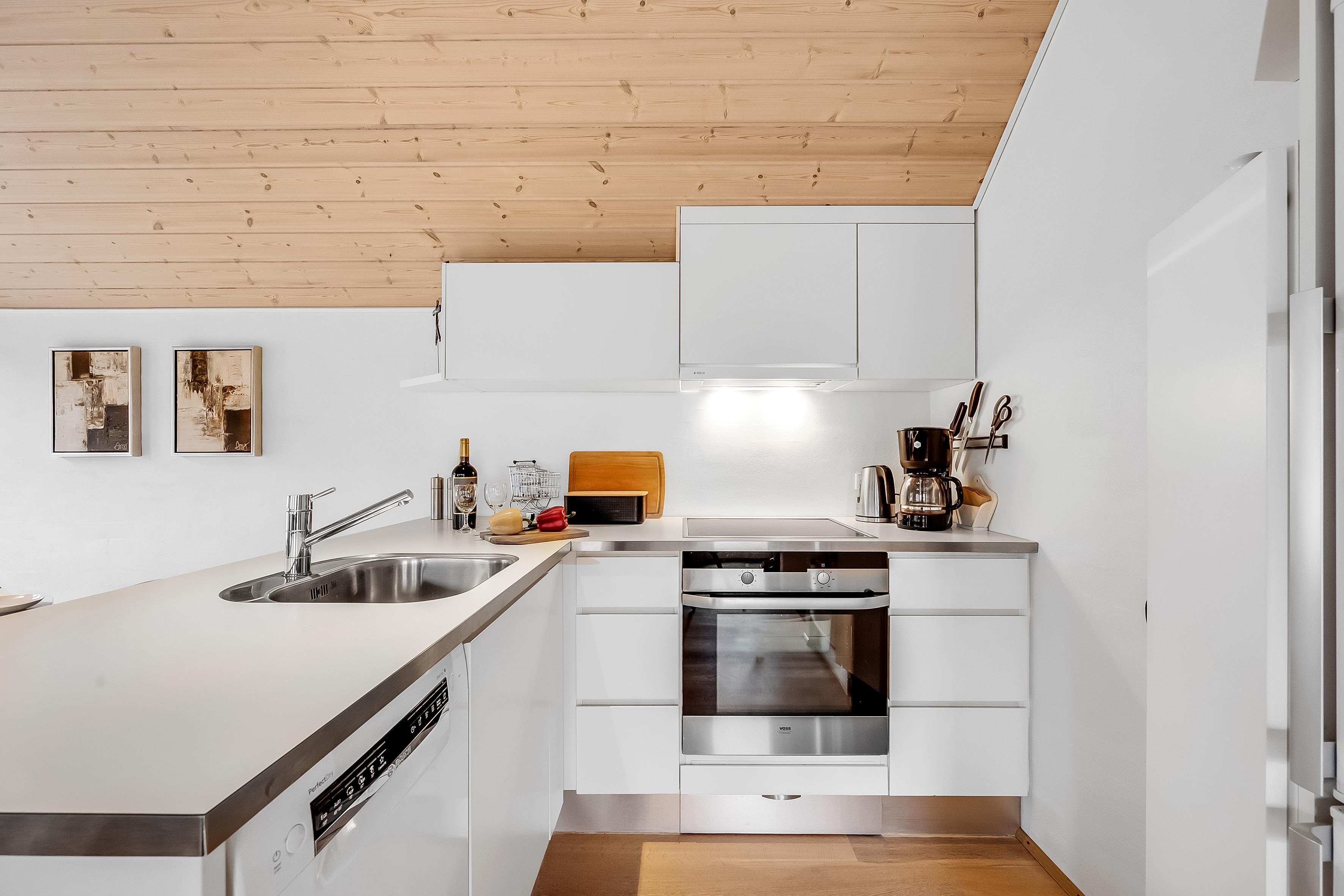 Für diejenigen, die gerne kochen, wird die Küche ein Genuss sein. Es ist mit modernen Geräten ausgestattet, darunter ein Backofen, ein Geschirrspüler, ein Kühlschrank und ein Gefrierschrank mit einem Fassungsvermögen von 40 Litern. Eine Waschmaschine und ein Trockner stehen ebenfalls zur Verfügung, sodass Sie Ihre Wäsche während Ihres Aufenthalts frisch halten können. Nach einem schönen Abendessen, können Sie einen gemütlichen Moment vor dem Holzofen genießen, der Wärme und Atmosphäre verbreitet.