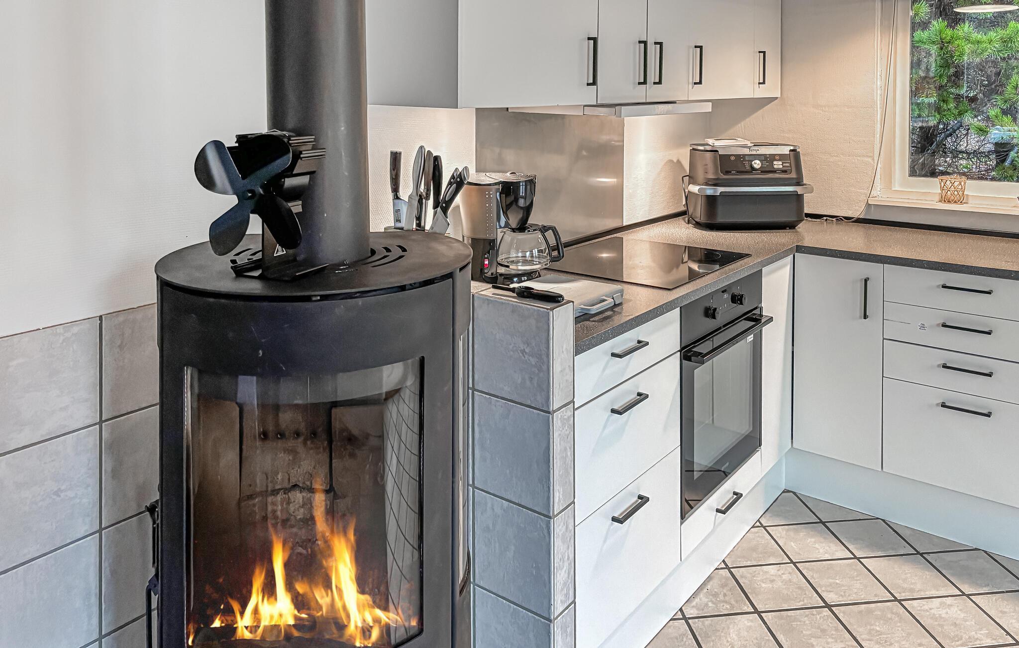 Machen Sie es sich auf dem großzügigen Ecksofa bequem und genießen Sie entspannte Abende vor dem Fernseher. Der angrenzende Essbereich im Wintergarten bietet Ihnen einen herrlichen Blick ins Grüne und schafft mit seinen großen Fensterflächen eine helle, einladende Atmosphäre. Nehmen Sie hier gemeinsam Platz und planen Sie bei einem guten Essen Ihre nächsten Ausflüge. In der praktisch gestalteten Küche mit direktem Zugang zur Terrasse bereiten Sie problemlos Ihre Mahlzeiten zu. An kühleren Tagen sorgt der Kaminofen für wohlige Wärme und eine behagliche Stimmung.