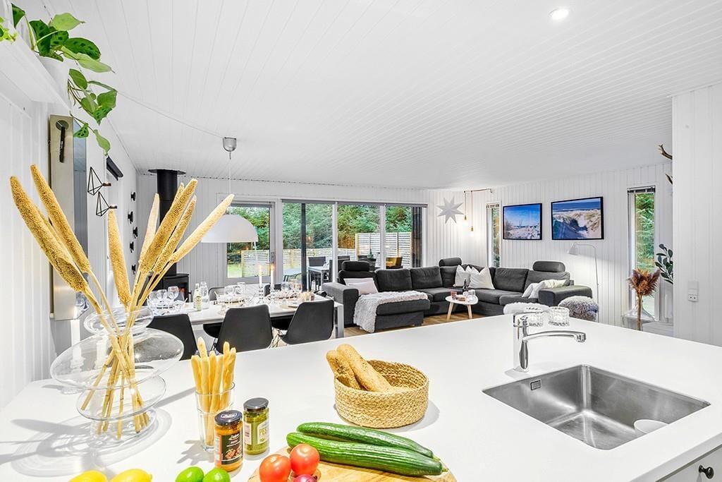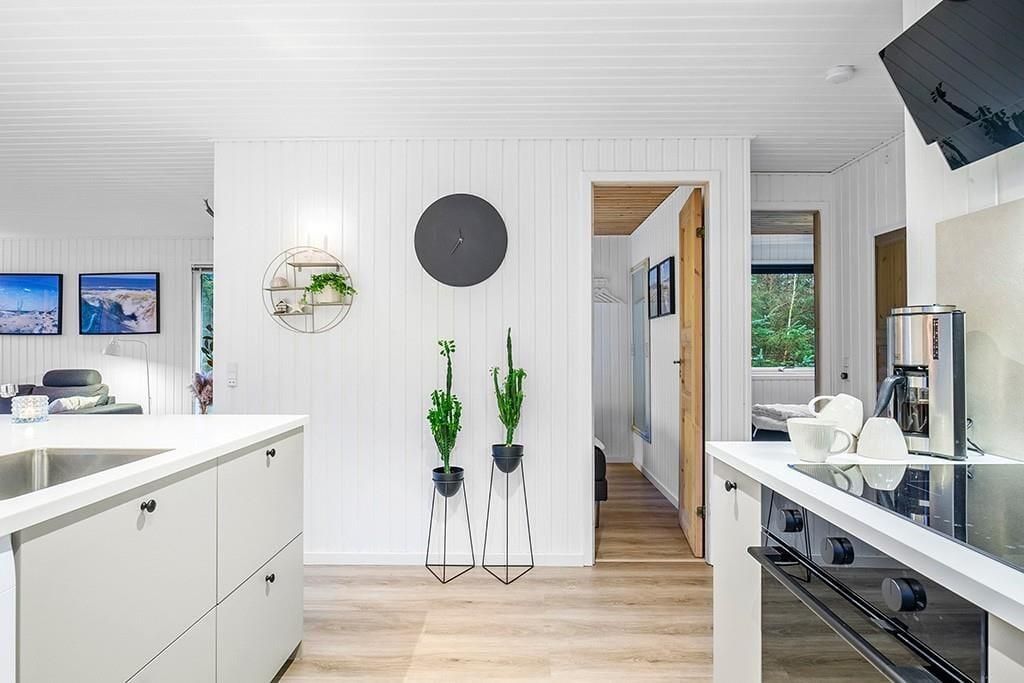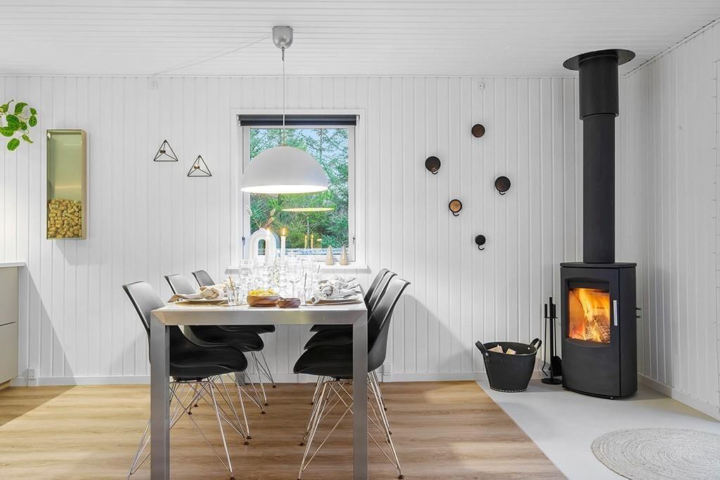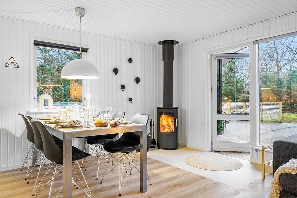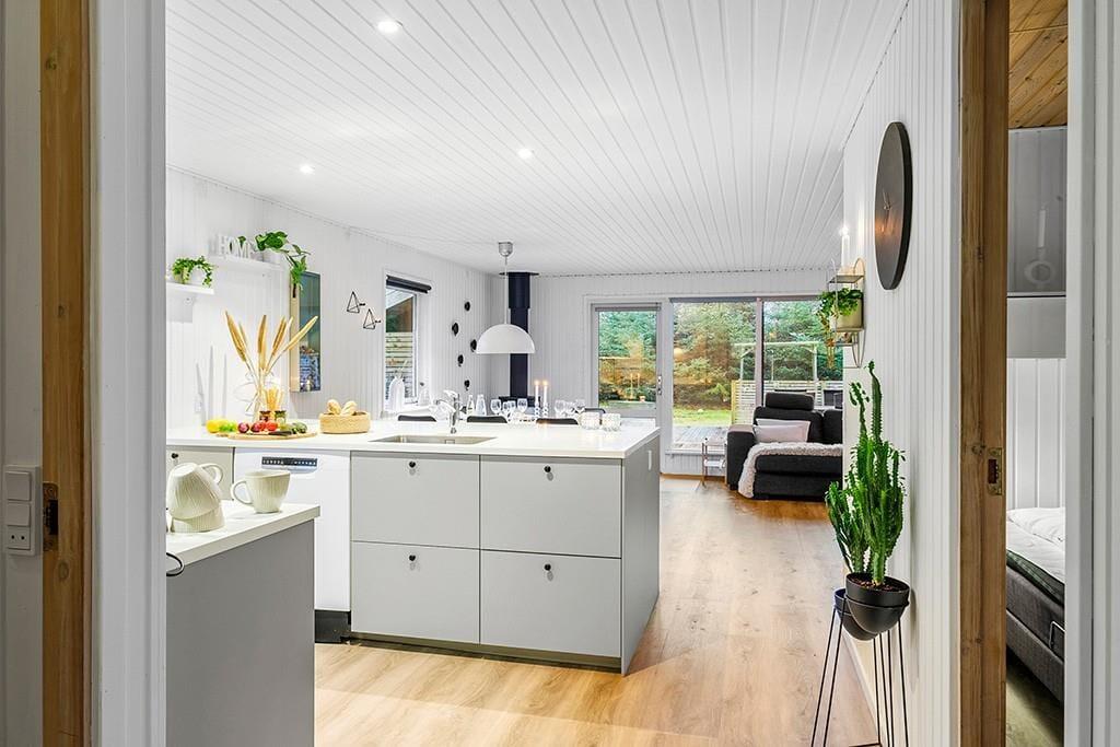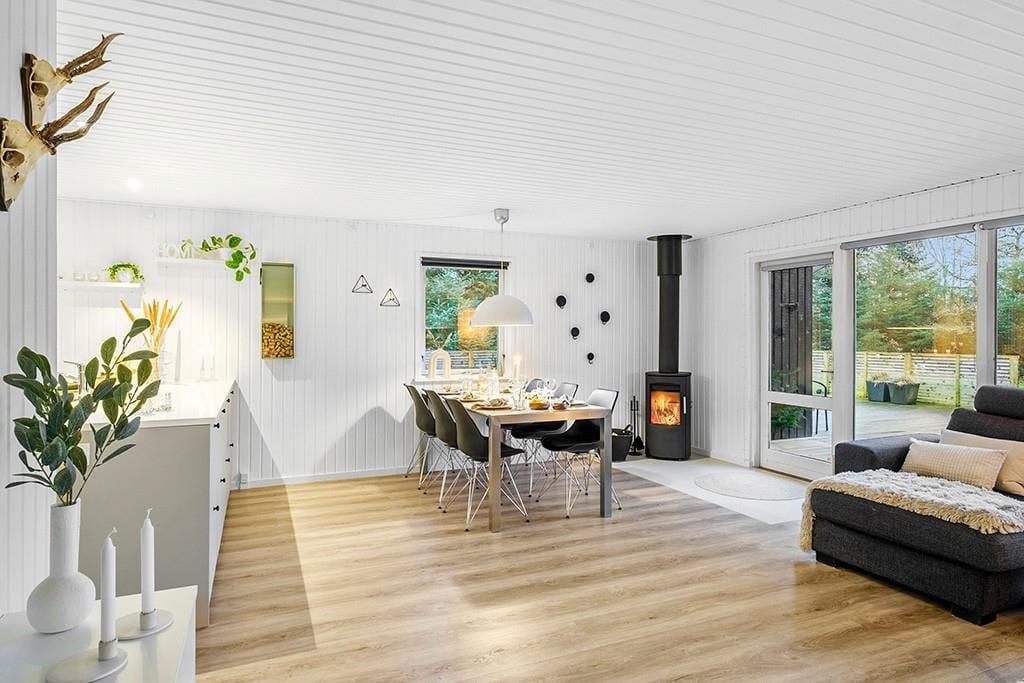 Im Inneren empfängt dich ein wunderschön renoviertes Ferienhaus mit einer ruhigen und exklusiven Atmosphäre. Helle Farben und eine stilreine Einrichtung ziehen sich durch das gesamte Haus und schaffen ein harmonisches Gesamtgefühl von Raum zu Raum. Der offene Wohnbereich vereint Küche, Essplatz und Wohnzimmer, sodass das Urlaubsleben ganz natürlich gemeinsam stattfinden kann – egal, ob du in der Küche zauberst, den Tisch für lange Abendessen deckst oder es dir mit einem guten Buch auf dem Sofa gemütlich machst. Die Küche ist modern und durchdacht gestaltet und verfügt unter anderem über einen eleganten Einbaubackofen, der perfekt zum klaren Design passt. Große Fenster lassen viel Tageslicht herein und bieten einen schönen Blick auf das grüne Grundstück, während der Kaminofen an kühleren Tagen für Wärme und Gemütlichkeit sorgt. Die Renovierung Ende 2025 ist sowohl im Komfort als auch in der Ästhetik deutlich spürbar – modern und zugleich wohnlich.
