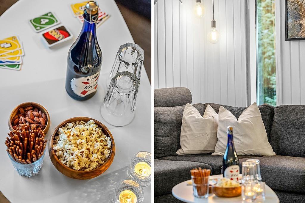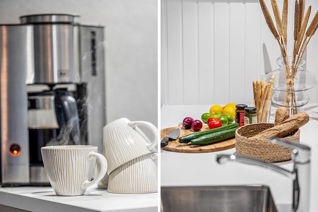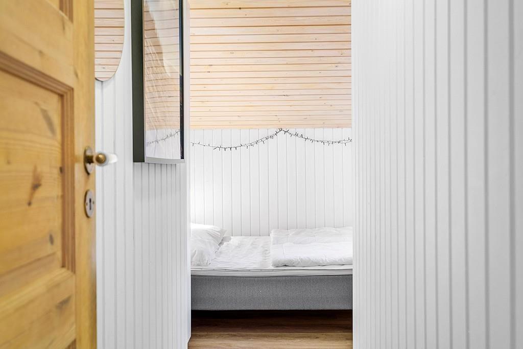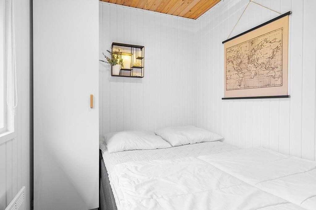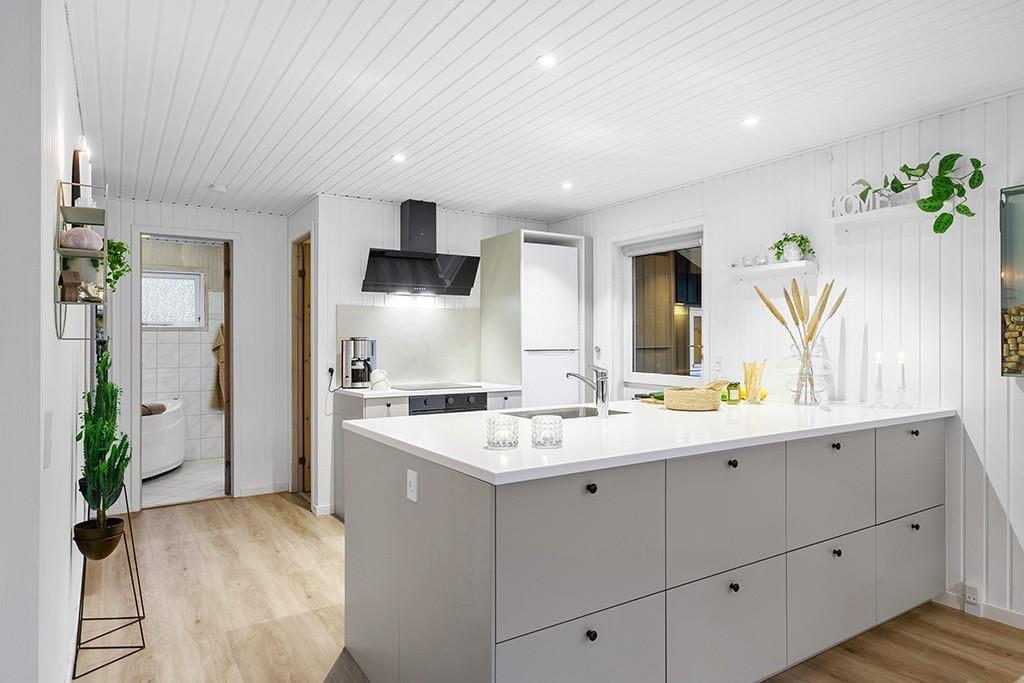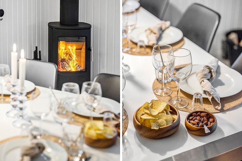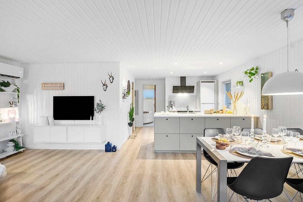 Im Inneren empfängt dich ein wunderschön renoviertes Ferienhaus mit einer ruhigen und exklusiven Atmosphäre. Helle Farben und eine stilreine Einrichtung ziehen sich durch das gesamte Haus und schaffen ein harmonisches Gesamtgefühl von Raum zu Raum. Der offene Wohnbereich vereint Küche, Essplatz und Wohnzimmer, sodass das Urlaubsleben ganz natürlich gemeinsam stattfinden kann – egal, ob du in der Küche zauberst, den Tisch für lange Abendessen deckst oder es dir mit einem guten Buch auf dem Sofa gemütlich machst. Die Küche ist modern und durchdacht gestaltet und verfügt unter anderem über einen eleganten Einbaubackofen, der perfekt zum klaren Design passt. Große Fenster lassen viel Tageslicht herein und bieten einen schönen Blick auf das grüne Grundstück, während der Kaminofen an kühleren Tagen für Wärme und Gemütlichkeit sorgt. Die Renovierung Ende 2025 ist sowohl im Komfort als auch in der Ästhetik deutlich spürbar – modern und zugleich wohnlich.