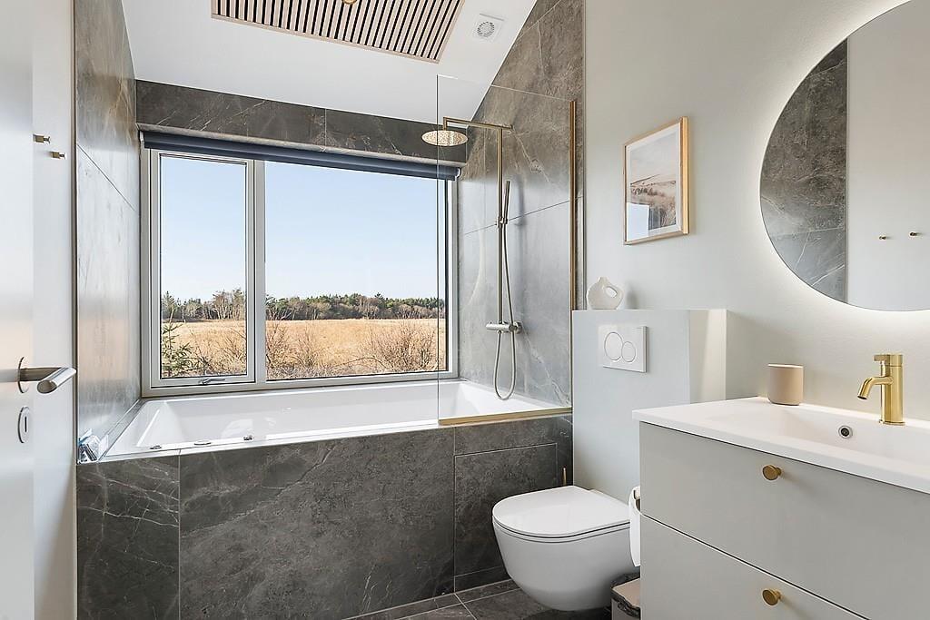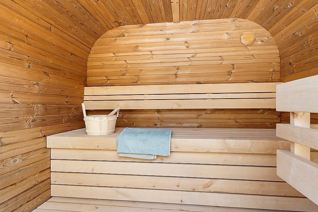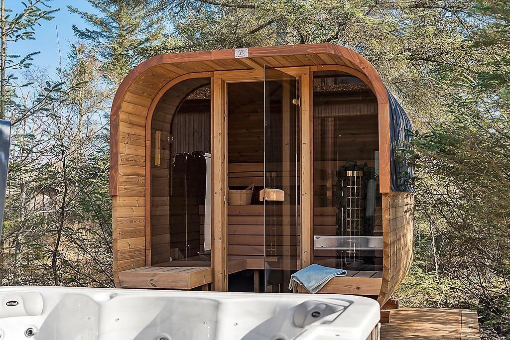 Auf der Terrasse finden Sie einen extra tiefen und großzügigen Whirlpool, in dem Sie im warmen Wasser entspannen können, während der Tag langsam ausklingt. Direkt daneben liegt die luxuriöse Sauna, so platziert, dass Sie durch die großen Fensterfronten des Hauses hinaus in die Natur und auf den Sonnenuntergang blicken können.