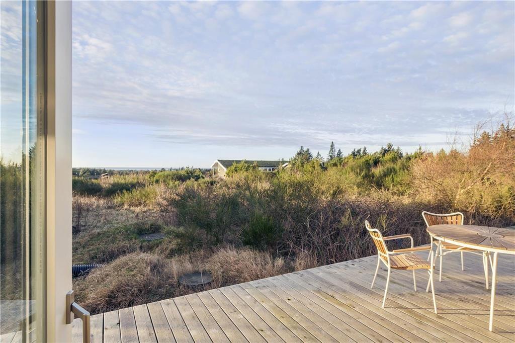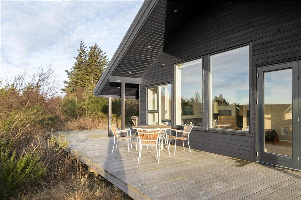 Selbstverständlich kommen Sie auch unter freiem Himmel in den Genuss der Panoramaaussicht über die wilde, raue Natur Nordjütlands. Eine große Holzterrasse schmiegt sich rund um das Haus. Egal, wo Sie hinschauen, Sie werden stets die beruhigende, entspannende Wirkung der Natur auf Geist und Seele verspüren. Die Terrasse empfängt Sie mit mehreren guten, teilweise auch überdachten Sitzecken. Somit können Sie auf der Terrasse zu jeder Tageszeit und bei nahezu jedem Wetter und jeder Windrichtung ein für Sie angenehmes Plätzchen finden.