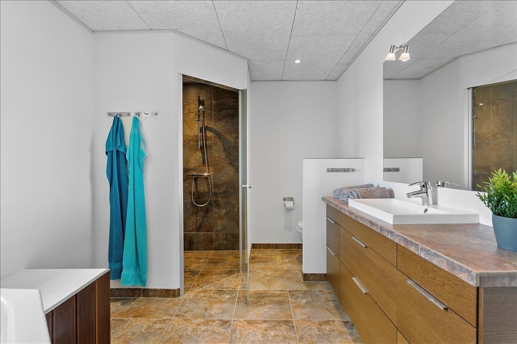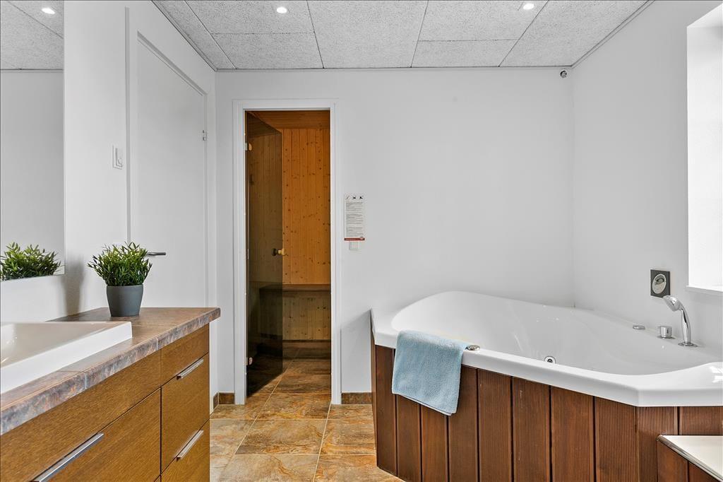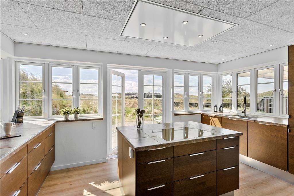 Im Inneren erwartet dich eine helle und offene Atmosphäre, bei der große Fensterpartien die Schönheit der Natur einladen und dir einen herrlichen Meerblick aus fast jedem Raum bieten. Die Küche ist sowohl funktional als auch schön, mit gutem Lichteinfall und modernen Annehmlichkeiten, die das Kochen zu einem Vergnügen machen. Hier kannst du die Familie zu gemeinsamen Mahlzeiten versammeln oder einfach vor dem Kamin entspannen und die Urlaubsstimmung genießen. Die beiden Badezimmer sind luxuriös und bieten sowohl eine Sauna als auch ein Whirlpool – perfekt, um dich nach einem aktiven Tag am Strand zu verwöhnen.