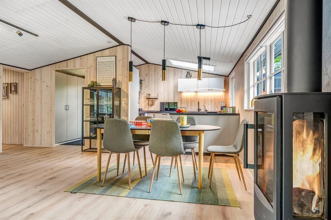 Drinnen erwartet dich ein helles und einladendes Ferienhaus mit einer modernen Küche und einem schönen Wohnzimmer mit Decken bis zum First – welches für für eine luftige und großzügige Atmosphäre sorgt. Vom Wohnzimmer hast du direkten Zugang zu einer schönen, überdachten Terrasse – perfekt für entspannte Stunden und lange Sommerabende.