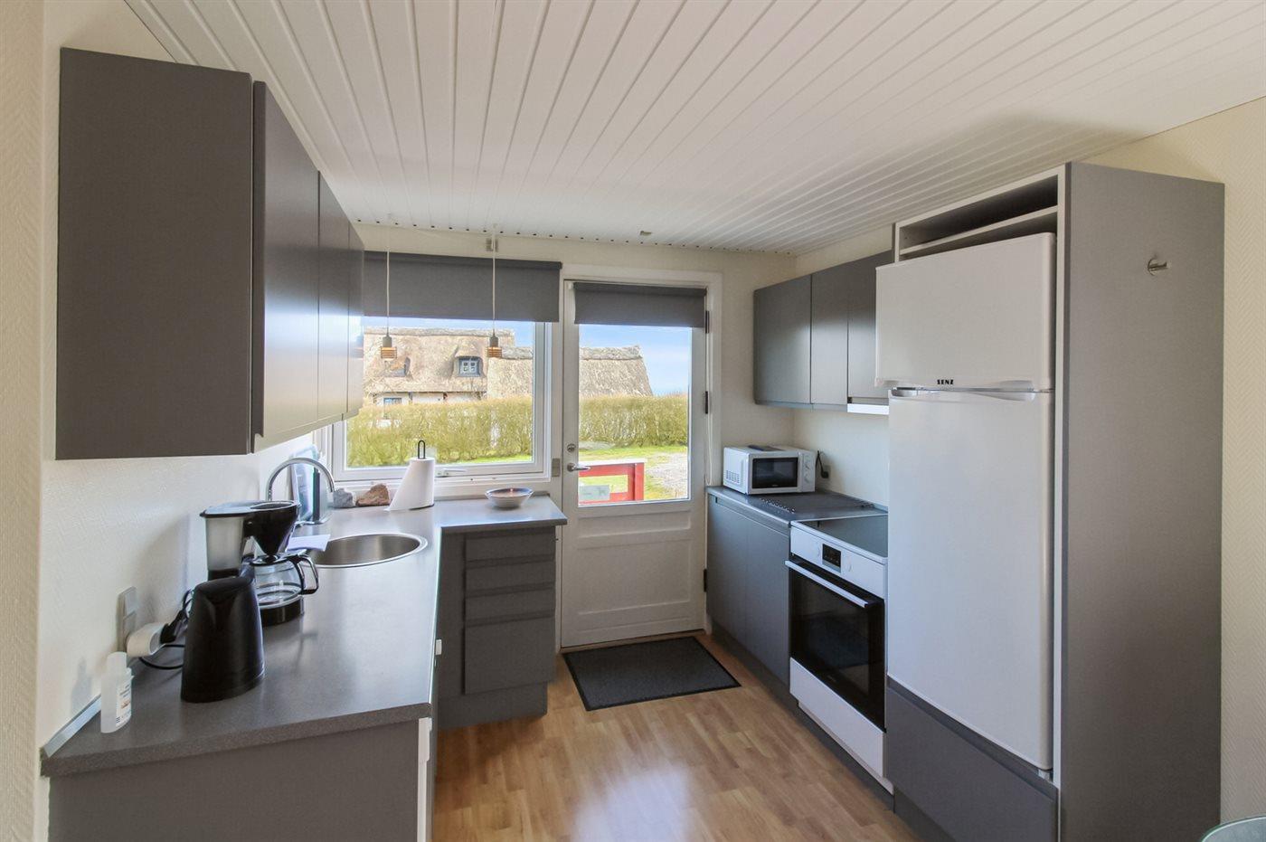 Die Küche ist mit Kühlschrank ausgestattet. Außerdem gibt es 4 Induktions-Kochzonen, Backofen, Mikrowelle sowie Geschirrspüler.