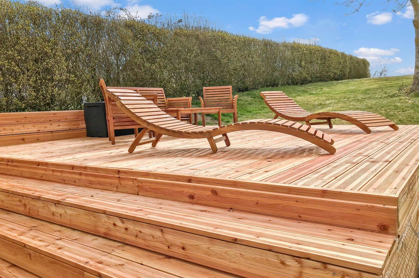 Dieses Ferienhaus liegt auf einem großen Grundstück in einem leicht hügeligen Gebiet – der Hauseingang und der Parkplatz liegen jedoch auf gleicher Ebene. Sowohl vom Haus als auch vom Grundstück können Sie das Meer ahnen. Zum Haus gehört eine große, teils überdachte Terrasse sowie eine neue und wirklich schöne Sonnenterrasse.