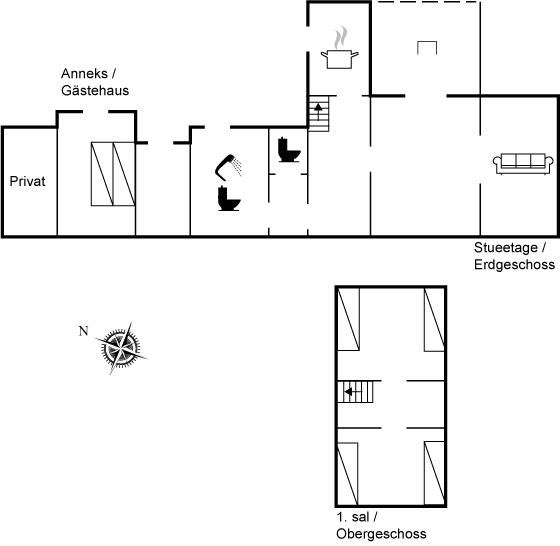 Die Einrichtung des Hauses ist rustikal und die Möbel sind dem ehemaligen Stil des Hauses angepasst. Die Schlafplätze verteilen sich auf 2 Schlafzimmer im Obergeschoss des Hauses und 2 Schlafplätze im Gästehaus (siehe Grundriss).