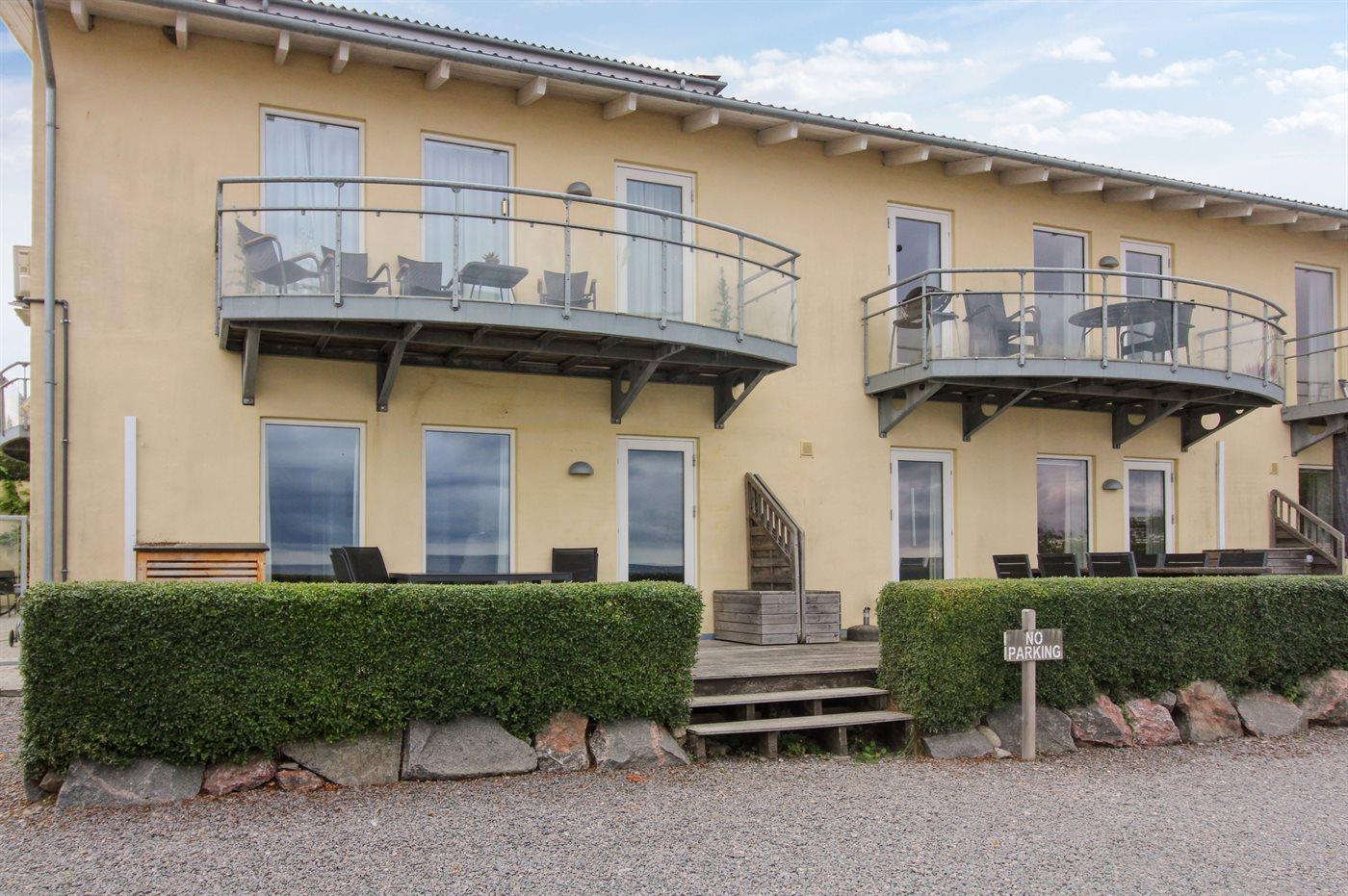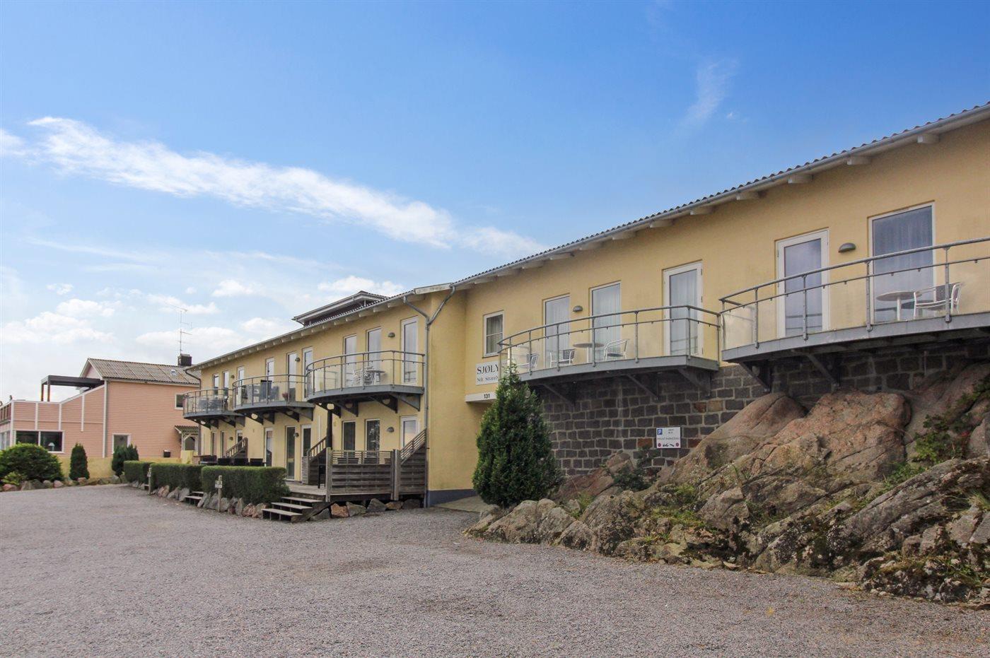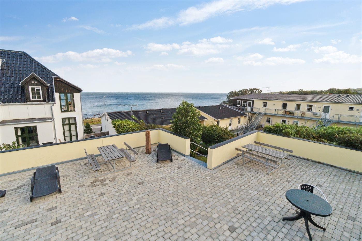 Die Wohnung befindet sich in der Ferienanlage Sjølyst, wo sich hinter dem Hauptgebäude eine größere erhöhte Terrassenfläche zur gemeinsamen Nutzung mit anderen Gästen in Sjølyst befindet. Von hier oben ist der Blick auf das Meer noch besser.