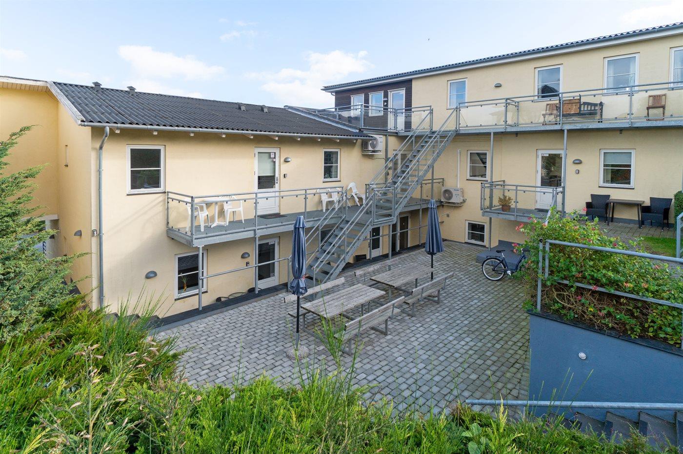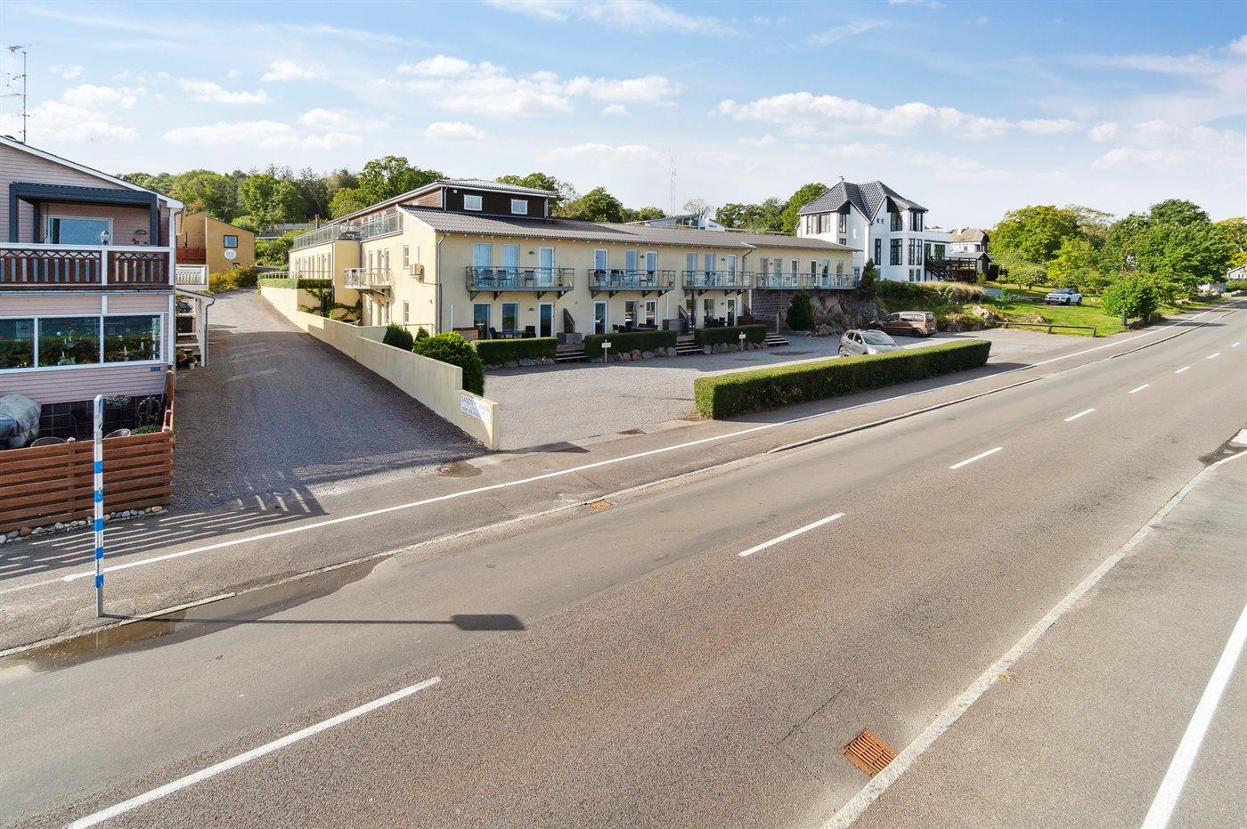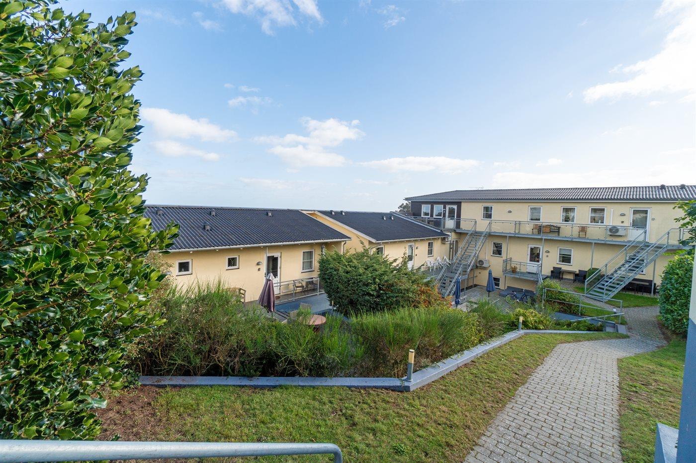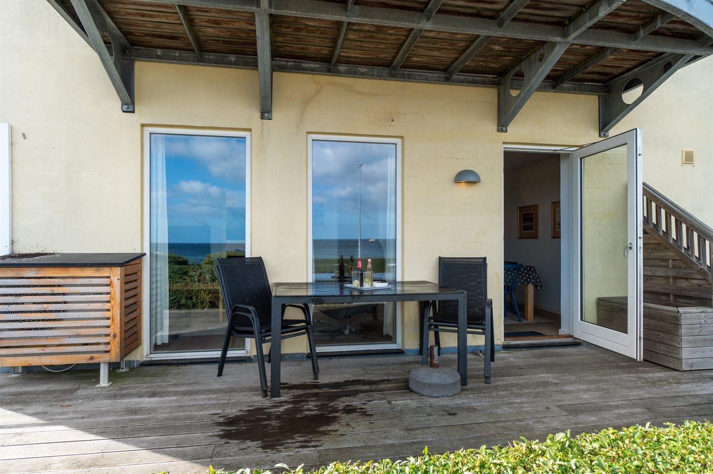 Die Wohnung befindet sich in der Ferienanlage Sjølyst, wo sich hinter dem Hauptgebäude eine größere erhöhte Terrassenfläche zur gemeinsamen Nutzung mit anderen Gästen in Sjølyst befindet. Von hier oben ist der Blick auf das Meer noch besser.