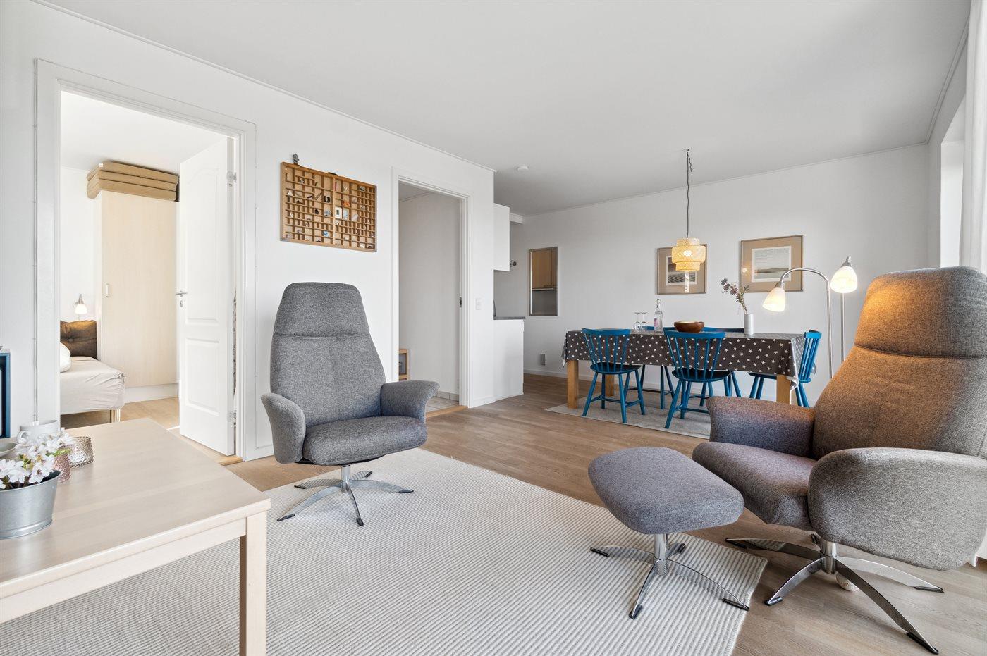 Die Wohnung ist so eingerichtet, dass es ein angenehmes Raumklima in hellen Räumen mit weißen Wänden und Decken gibt, die zusammen mit der schönen Einrichtung einen erholsamen Urlaub ermöglichen.