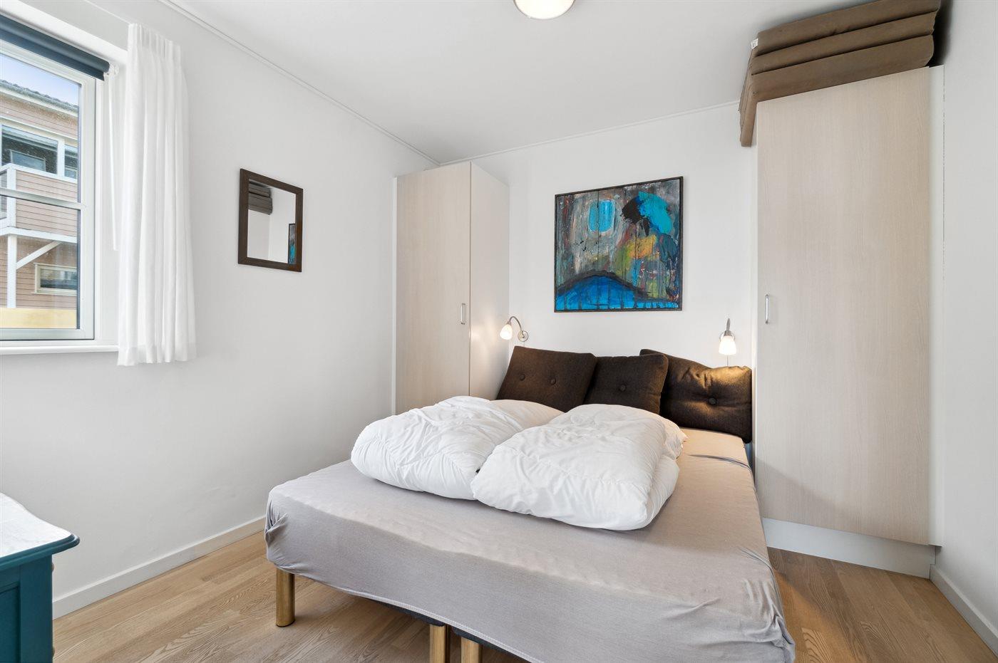 Es gibt einen Schlafraum. 2 Schlafplätze in einem Doppelbett. 2 Schlafplätze auf einer Doppelschlafcouch. 2 von diesen Schlafplätzen befinden sich im Wohnzimmer.