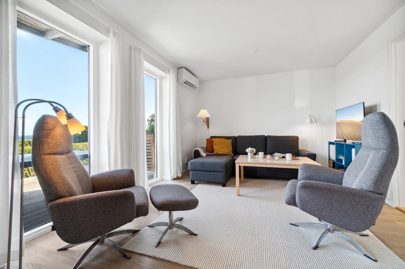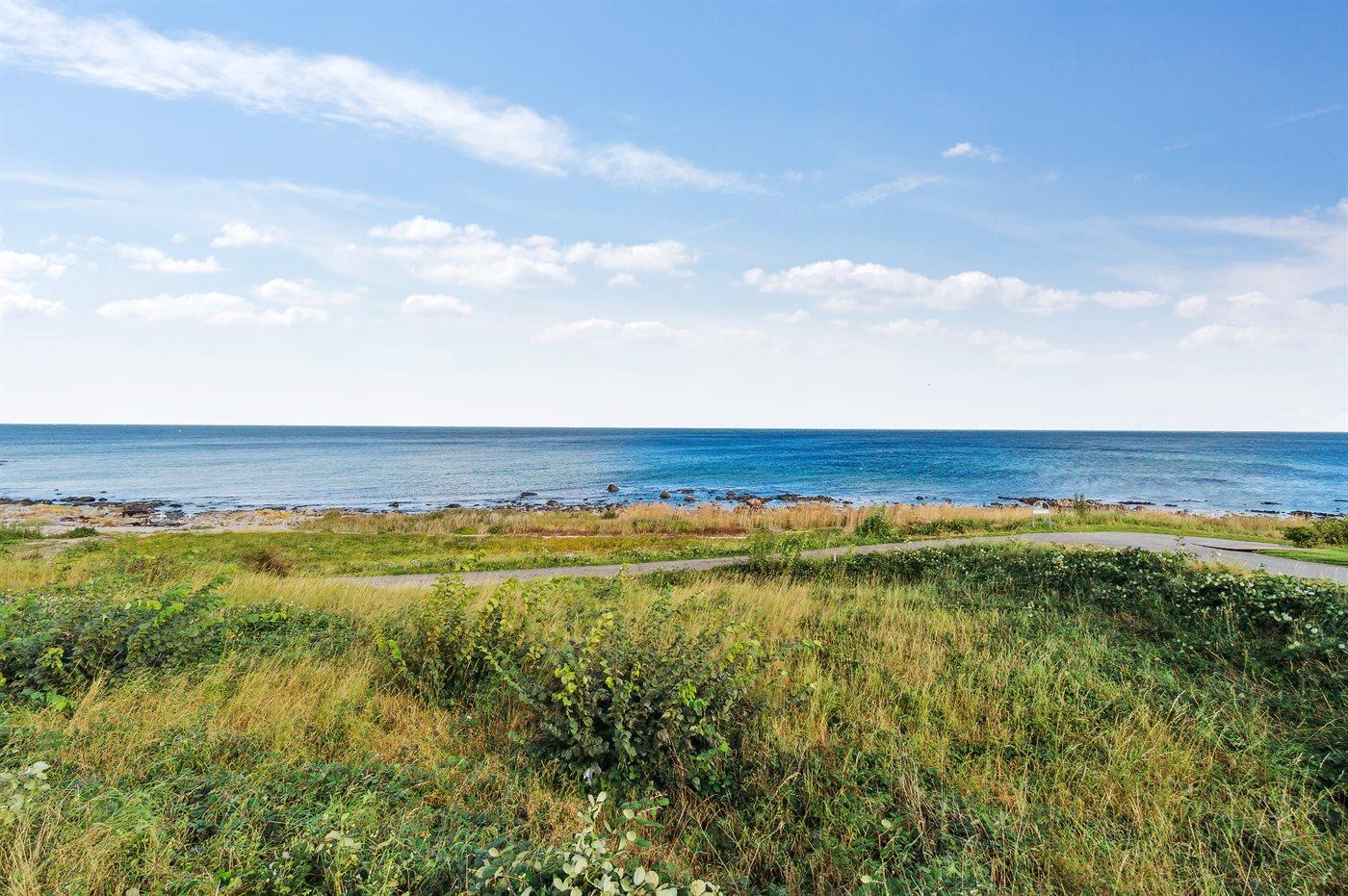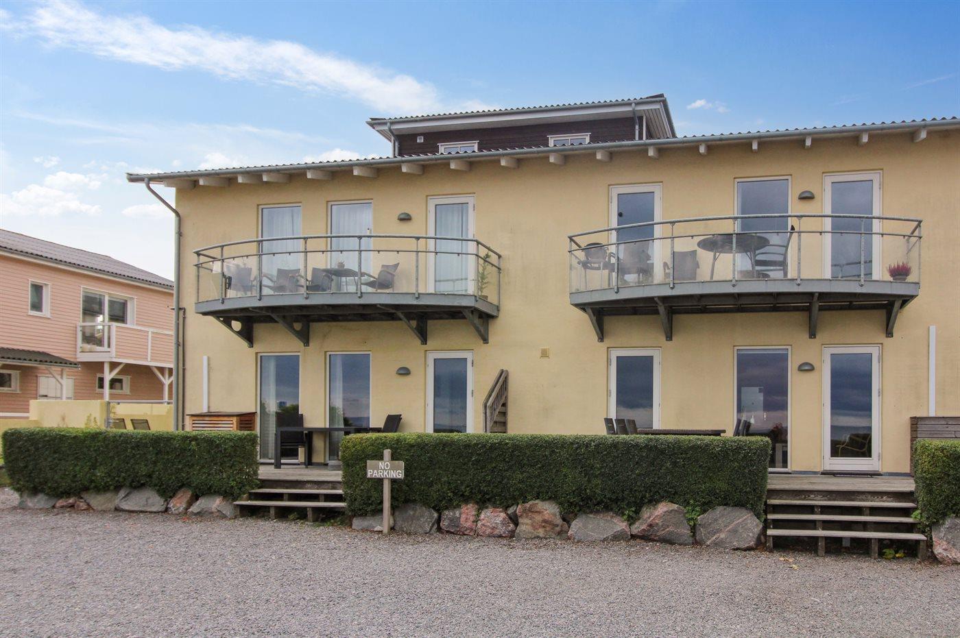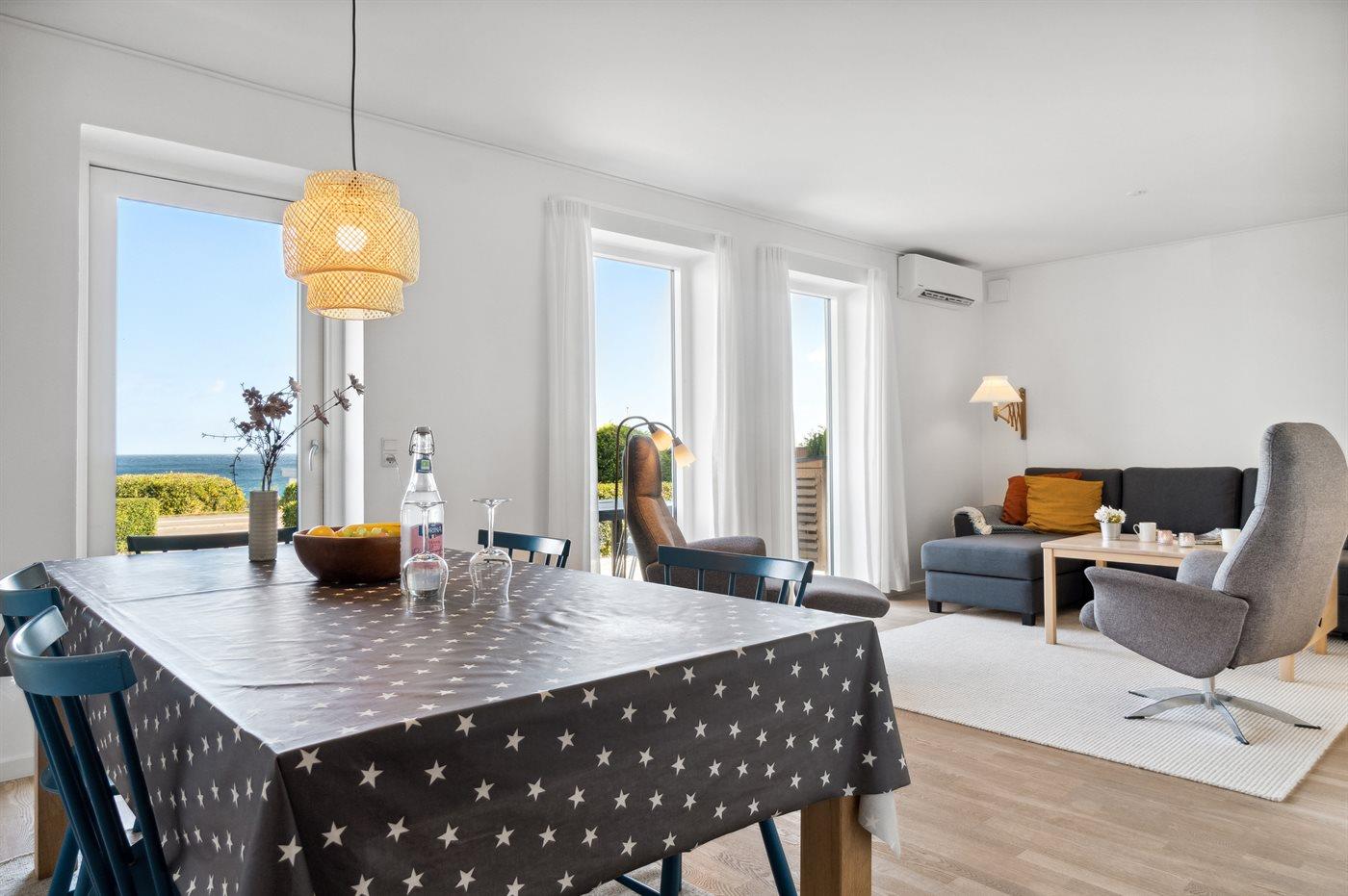 Genießen Sie eine helle Ferienwohnung mit Panoramablick auf die Ostsee und nur 75 m vom Sandstrand in Sandkås entfernt.