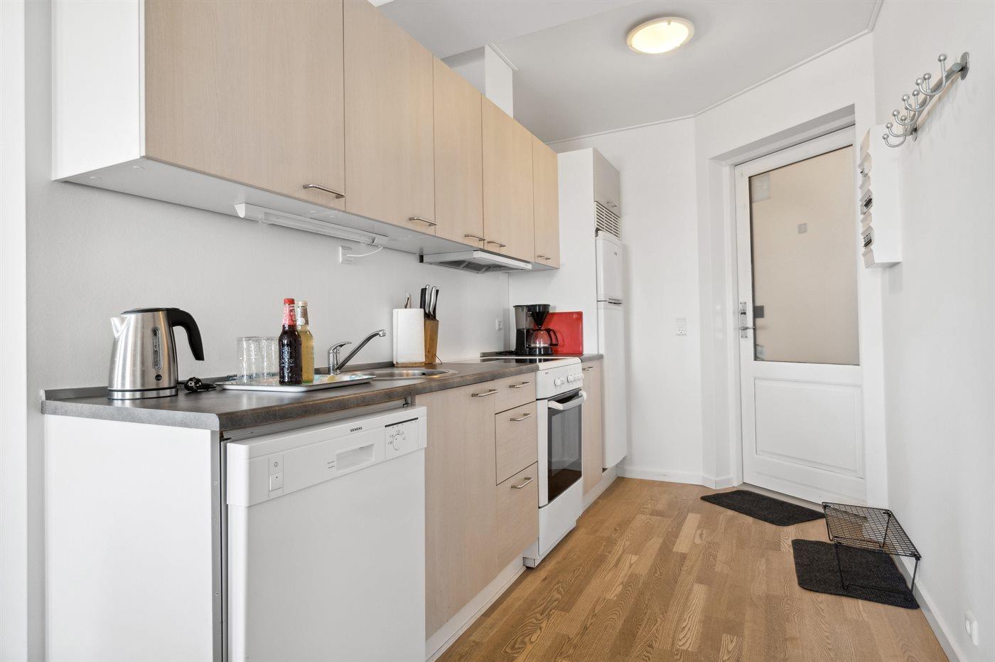 Die Küche ist mit Kühlschrank ausgestattet. Außerdem gibt es 4 Keramik-Kochfelder sowie Geschirrspüler.