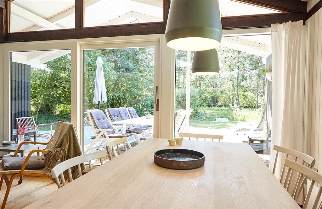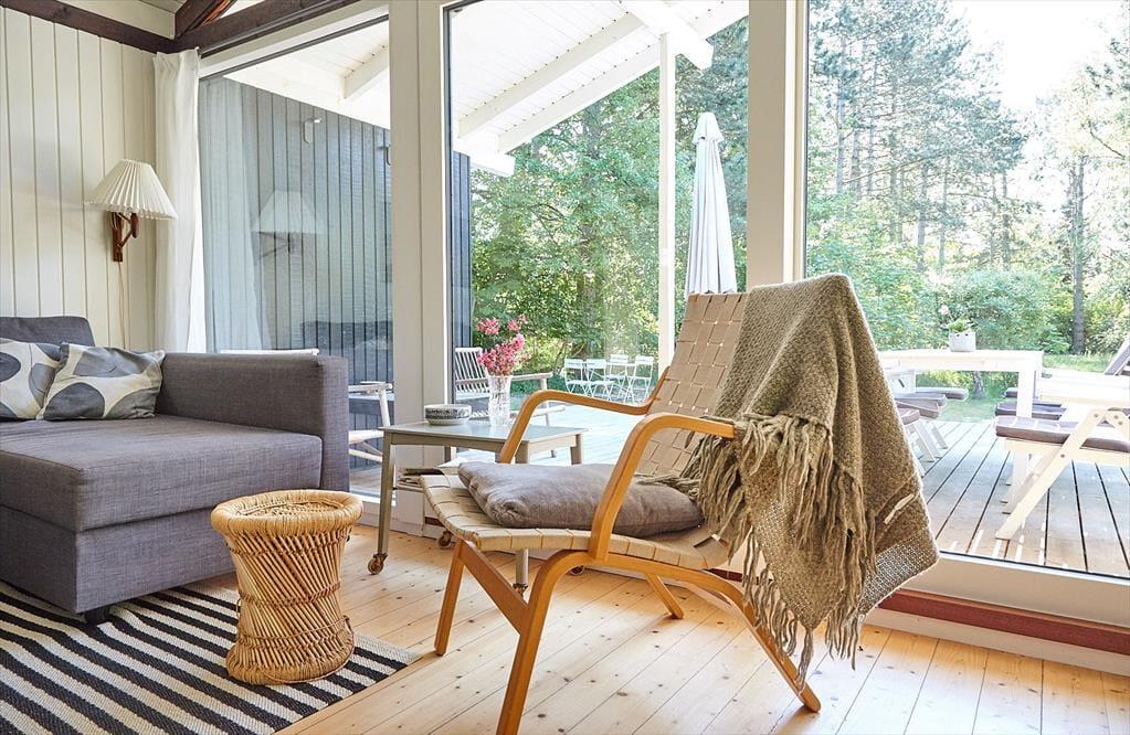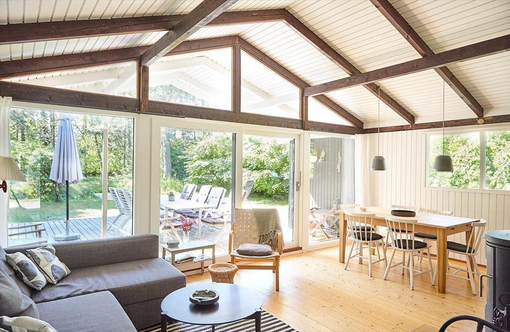 Tritt ein in die schöne und gemütliche Atmosphäre dieses Feriendomizils. Die Decke ist nach oben offen und sorgt für ein Gefühl von Geräumigkeit. Das große Wohnzimmerfenster lässt deinen Blick frei auf das große Naturgrundstück schweifen und gibt dir das Gefühl von Urlaub und Entspannung. In der Küche, die zentral zwischen den beiden Terrassen liegt, könnt ihr gemeinsam leckere Urlaubsmahlzeiten zubereiten. Die Abende genießt ihr vor dem Holzofen, wo ihr einen guten Film schauen oder mit einem Buch auf dem Sofa entspannen und Kraft für den nächsten Tag tanken könnt.