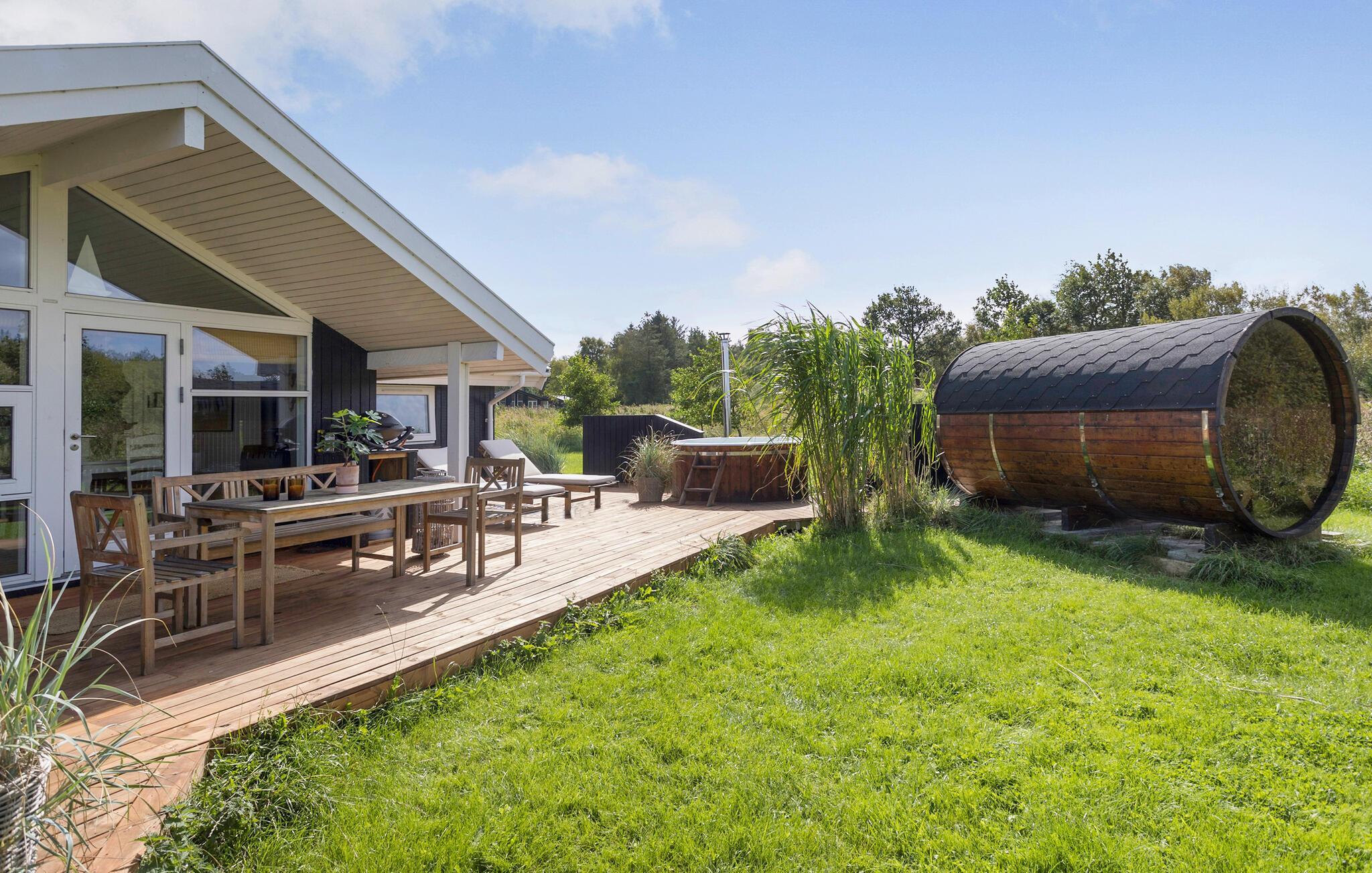 Der Außenbereich ist jedoch vielleicht das Highlight des Hauses - neben der schönen Terrasse mit hochwertigen Gartenmöbeln finden Sie hier sowohl ein finnisches Holzbad als auch eine Sauna vor. Der Limfjord und der Sandstrand sind nur 450 m entfernt und bieten tolle Bademöglichkeiten - für die Frischen natürlich das ganze Jahr über und zwar mit der Möglichkeit, anschließend in die Sauna zu gehen.