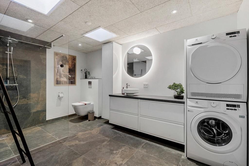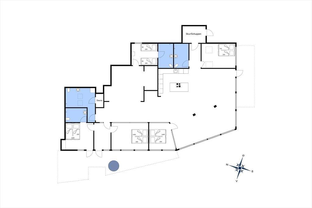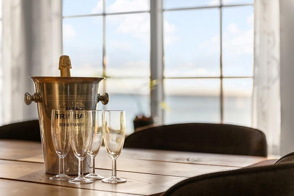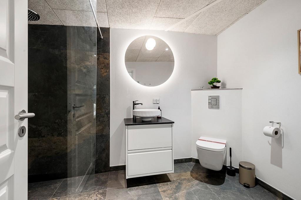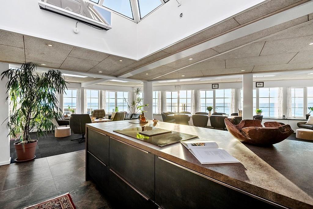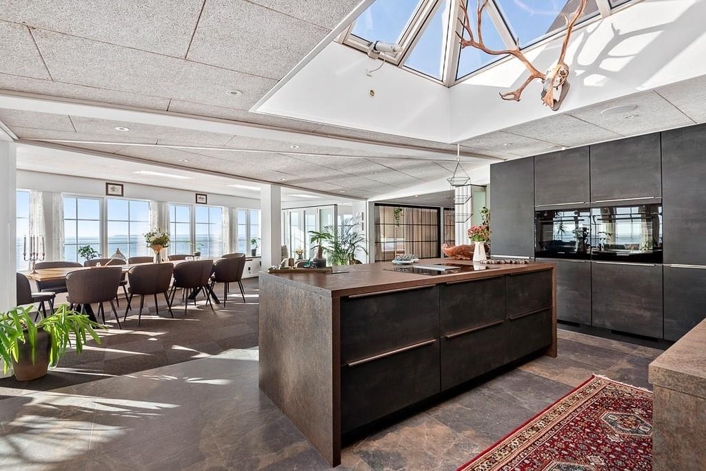 Im Inneren erwartet dich ein hochwertiges Wohnküchen-Ensemble, in dem das Licht durch die Oberlichter einfällt und den Raum hell, offen und einladend wirken lässt. Hier gibt es viel Platz, um sich beim Kochen und bei gemeinsamen Mahlzeiten zu versammeln, während Gespräche ganz natürlich zwischen Küche und Essbereich fließen. Der gesamte Wohnbereich bietet Panoramablick und schafft eine stimmungsvolle Kulisse für lange Abendessen und gemütliche Abende, bei denen das sanfte Licht und die Natur draußen ein fester Teil des Erlebnisses sind. Das Ferienhaus verfügt über angenehme Schlafbereiche, die durch eine New-Yorker-Wand mit Vorhängen vom Wohnraum getrennt sind, sowie über mehrere Badezimmer, sodass alle entspannt und komfortabel in den Tag starten können – auch wenn ihr mit vielen Personen anreist. Wenn der Körper nach zusätzlicher Entspannung verlangt, kannst du die wohltuende Wärme der Infrarotsauna genießen, bevor du es dir auf dem Sofa gemütlich machst, eine Runde im Aktivitätsraum spielst oder zur Ruhe kommst – mit Blick auf das Wasser.