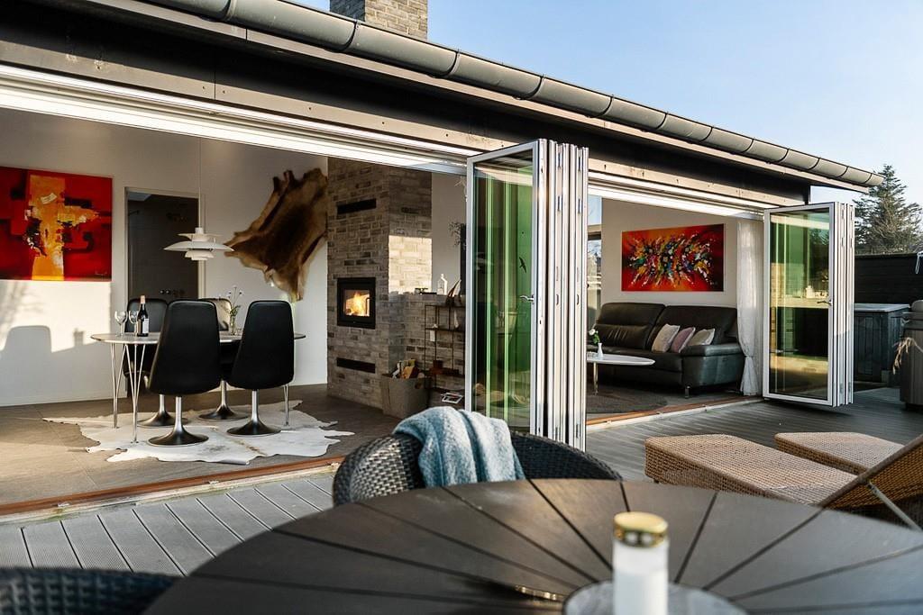 Die großen Schiebetüren des Ferienhauses können vollständig zur Seite geschoben werden, sodass die Grenze zwischen drinnen und draußen nahezu verschwindet. Auf diese Weise verschmelzen Wohnzimmer und Terrasse zu einem gemeinsamen Aufenthaltsraum, in dem du dich frei zwischen Sonne, frischer Luft und Innenkomfort bewegen kannst. Die Terrasse ist der perfekte Ort, um den Tag mit einem Frühstück im sanften Licht zu beginnen oder ihn mit einem Glas Wein ausklingen zu lassen, während sich der Himmel in goldene und rosafarbene Nuancen färbt.