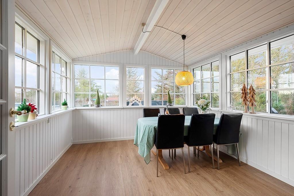 Im Inneren empfängt dich ein helles, einladendes und gemütliches Ferienhaus, in dem man die Liebe zum Detail und zur klassischen Ferienhausstimmung sofort spürt. Das schöne Wohnzimmer ist der natürliche Treffpunkt des Hauses, und an kühleren Tagen kannst du den Kaminofen anheizen, die wohlige Wärme genießen und zur Ruhe kommen, während die Flammen leise knistern. Der Wintergarten ist ein ganz besonderer Raum – hier strömt das Licht durch die großen Fenster, und du kannst beim Abendessen, bei einem Spiel am Tisch oder mit einer guten Tasse Kaffee sitzen, während der Blick in den Garten eine stimmungsvolle Kulisse bildet. Die zwei Schlafzimmer des Ferienhauses, von denen sich eines im Annex befindet, sind mit Fokus auf Komfort und Ruhe eingerichtet, sodass du erholt aufwachst und bereit für einen neuen Urlaubstag bist. Hier ist der Rahmen für Entspannung, Zeit miteinander und langsame Momente geschaffen, in denen der Alltag ganz weit weg scheint.