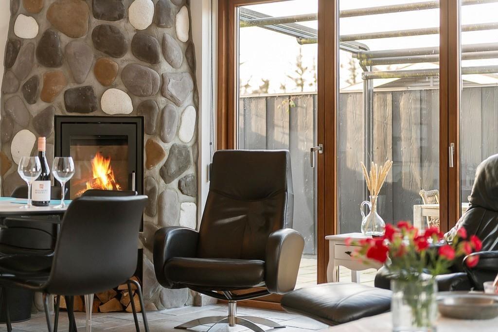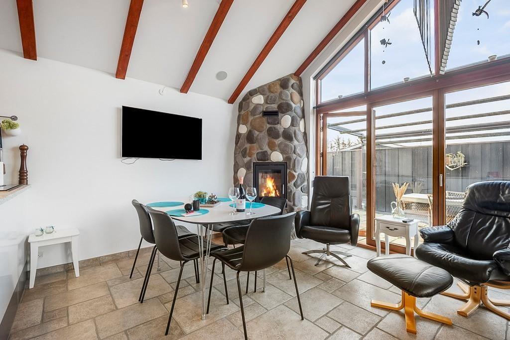 Wenn du das Ferienhaus betrittst, empfängt dich ein warmer und einladender Raum, in dem Wohnküche und Wohnzimmer zu einem großen Aufenthaltsbereich verschmelzen. Das Licht fällt schön durch die großen Fensterfronten und schafft eine helle und luftige Atmosphäre, die sowohl zu Gemütlichkeit als auch zu gemeinsamen Stunden einlädt. Hier lässt sich leicht vorstellen, wie ruhige Morgen beginnen, während du mit einer Tasse Kaffee am Esstisch sitzt und das Haus langsam zum Leben erwacht.
