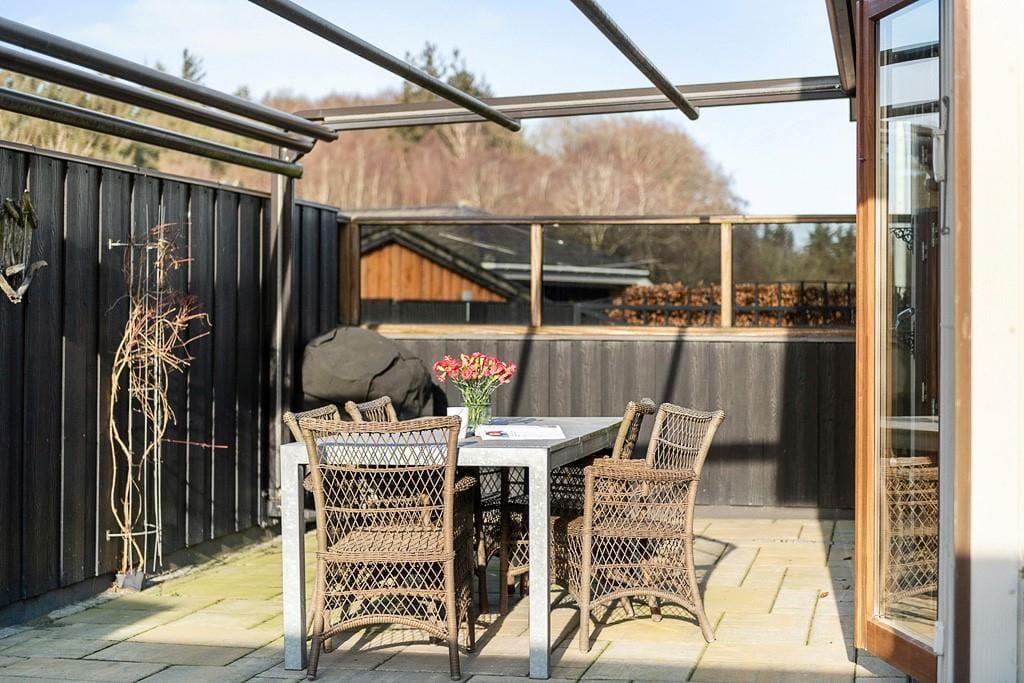 Die vielen Terrassen des Ferienhauses laden dazu ein, den Lauf der Sonne über den Tag zu verfolgen und immer einen Platz zu finden, der zur Stimmung passt. Wenn die großen Türen zur Terrasse vollständig geöffnet werden, verschwindet die Grenze zwischen drinnen und draußen, und das Haus wirkt wie eine große, zusammenhängende Oase. Die Markise über der Terrasse spendet an warmen Tagen Schatten, sodass du das Leben im Freien entspannt genießen kannst, ohne nach drinnen gehen zu müssen.