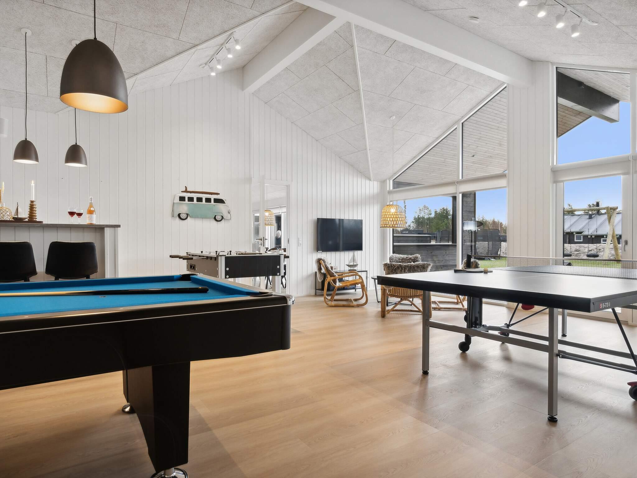 Indendørs samles I om flere små og store oplevelseszoner. Aktivitetsrummet fungerer som husets legeplads med billard, bordfodbold, bordtennis og dart samt projektor og lærred – perfekt til turneringer, filmaftener, præsentationer, små pauser eller rolige stunder i sofaområdet. Poolafdelingen indbyder til både leg og ro, hvor vandet er behageligt tempereret, og rutsjebanen giver garanti for grin.