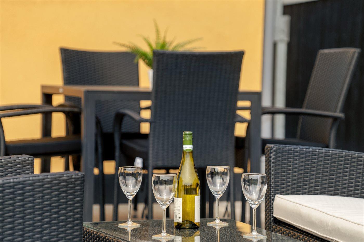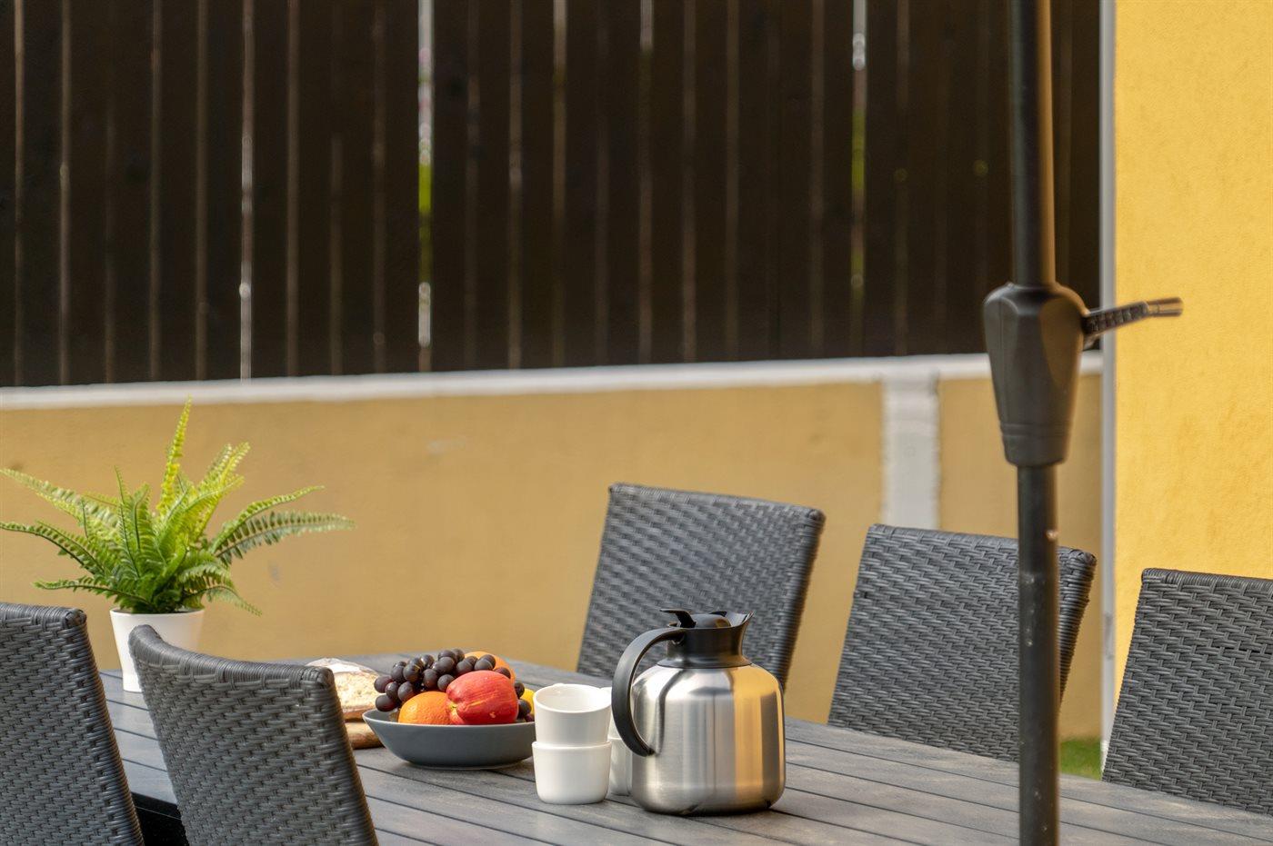 Die Ferienunterkunft liegt auf einem 750 m² großen Gartengrundstück. Die Entfernung zum Meer beträgt 1100 m. Die nächste Einkaufsmöglichkeit liegt 50 m entfernt. Es steht ein 68 m² Terrassenareal zur Verfügung. Schaukel. Es ist ein Ladestecker für Elektroautos installiert. Parkplatz auf dem Grundstück.