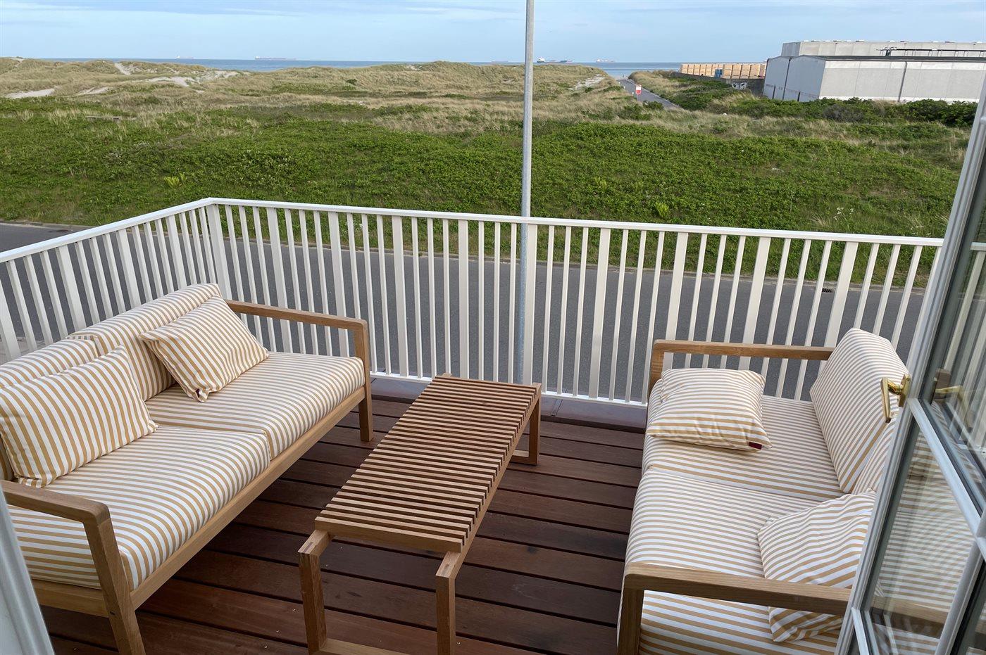 Modernes Stadthaus in Skagen mit Meerblick, großzügigen Terrassen und nahe Hafen sowie Badestrand.