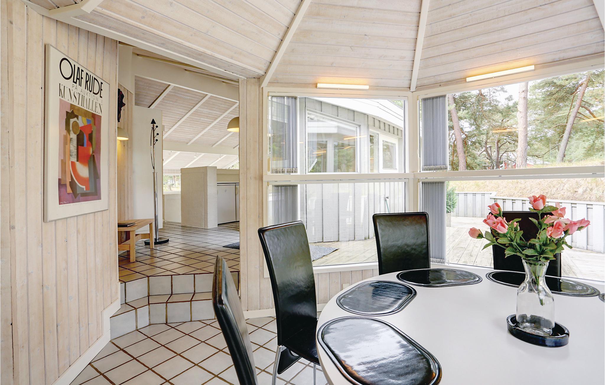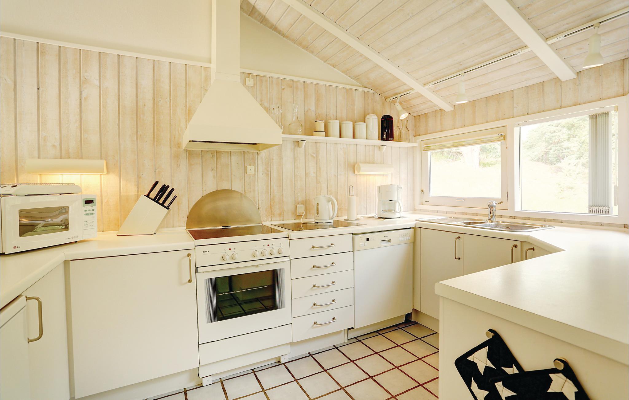 Umgeben von Hügeln mit Kiefernwäldern liegt dieses herrliche Holzferienhaus inmitten ruhiger und schöner Natur. Das Haus ist von geschützten Holzterrassen umgeben, wo Sie den ganzen Tag über die Sonne und die Umgebung genießen können. Sie können sich natürlich auf für den herrlichen Dueodde Strand oder die Herausforderungen des nahe gelegenen Golfplatzes entscheiden. Das Haus ist geschmackvoll mit hellen Farben und modernen Möbeln eingerichtet. In den Aufenthaltsräumen und in Bädern und Küche gibt es beheizbare Klinkerböden. Die schöne und gut ausgerüstete Küche ist zum versetzten, mit Ledermöbeln ausgestatteten Wohnzimmer hin offen. Das große der zwei Bäder hat einen vier-sechs-Personen-Whirlpool und eine gute Sauna.