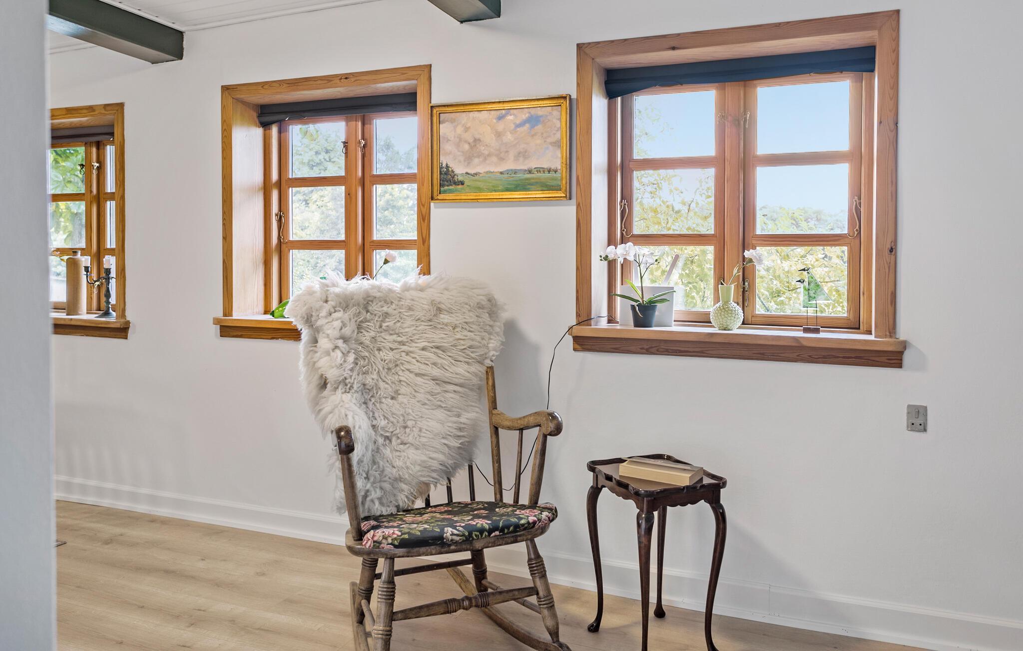Willkommen in diesem einladenden Ferienhaus mit Reetdach in Spodsbjerg, das idyllisch inmitten der Natur liegt und den idealen Rückzugsort für einen erholsamen Urlaub bietet. Das traditionelle Fachwerkhaus strahlt Gemütlichkeit und rustikalen Charme aus und ist von einem schönen, gepflegten Garten umgeben, der Sie zum Entspannen und Verweilen einlädt. Im Inneren des Hauses erwartet Sie eine gemütliche Atmosphäre mit liebevoll gestalteten Räumen. Der lichtdurchflutete Wohnbereich mit bequemen Sofas und einem rustikalen Schaukelstuhl bietet Ihnen die perfekte Kulisse für entspannte Nachmittage.