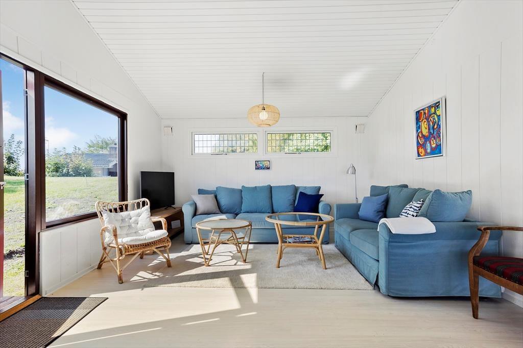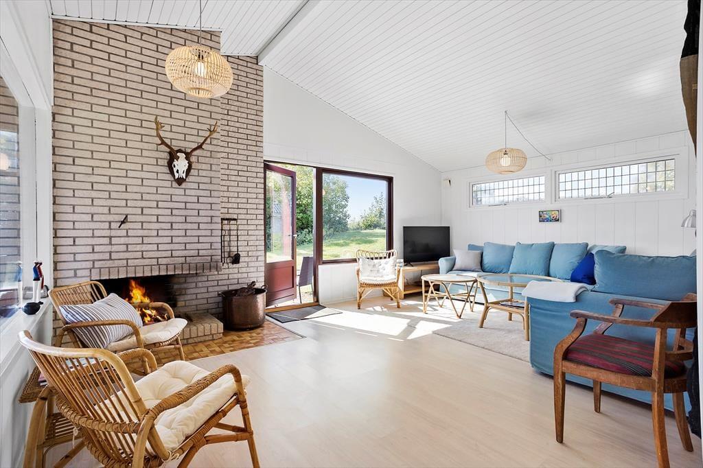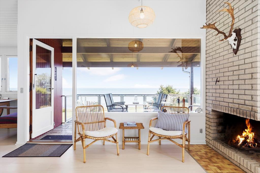 Im Inneren erwartet Sie eine helle und einladende Atmosphäre, in der der Blick auf das Meer ein natürlicher Teil der Einrichtung ist. Der offene Wohn- und Essbereich mit Küche bildet das Herz des Hauses und bietet einen beeindruckenden Ausblick auf das Wasser. Große Fenster lassen viel Tageslicht herein und verstärken das Gefühl, mitten in der Natur zu wohnen. Vom Wohnzimmer aus gelangen Sie direkt auf die Terrasse, sodass Innen- und Außenbereich harmonisch ineinander übergehen. Der Kamin sorgt an kühleren Tagen für wohlige Wärme und macht das Haus zu einem idealen Urlaubsziel zu jeder Jahreszeit. Zwei Schlafzimmer mit komfortablen Betten sowie ein zusätzliches Schlafsofa bieten flexible Übernachtungsmöglichkeiten. Das Badezimmer ist funktional eingerichtet und mit einer Duschkabine ausgestattet.