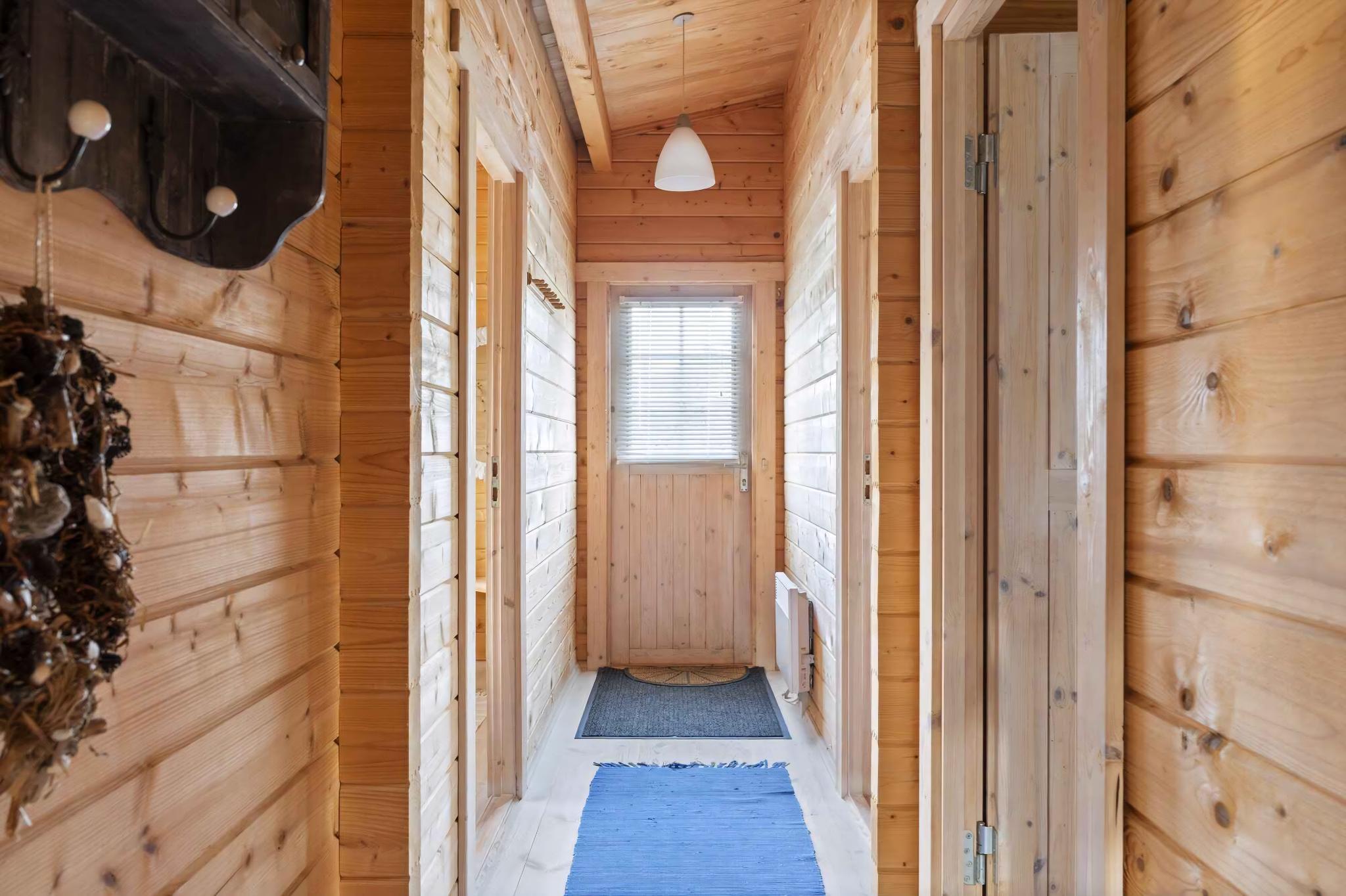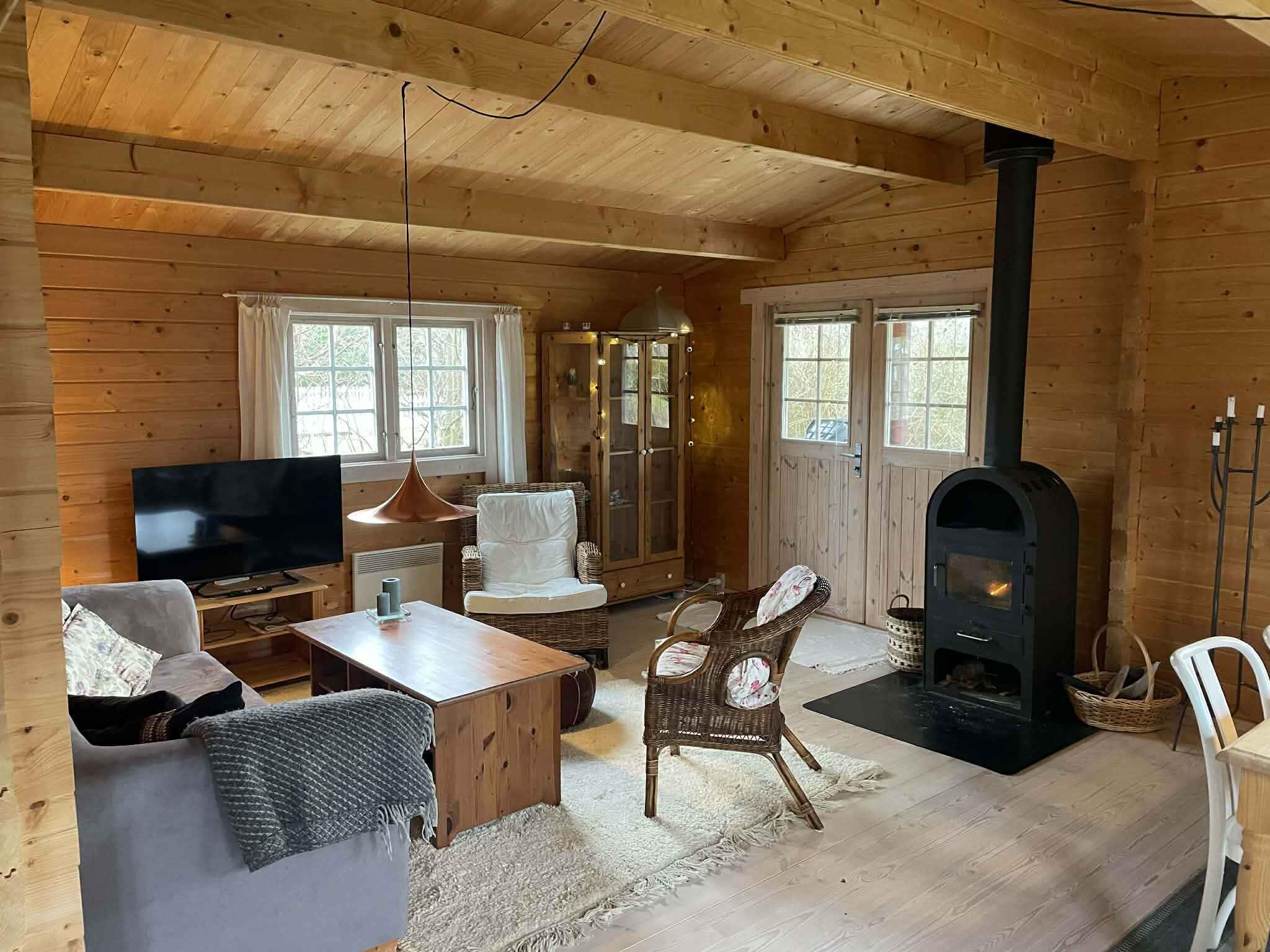 Charmantes Blockhaus mit 75 m², 3 Schlafzimmern und 6 Schlafplätzen. Heller Wohn- und Küchenbereich in offener Verbindung, Bad mit Sauna und Zugang zur Veranda. Ruhige Lage am Ende einer Sackgasse, nur 300 m vom Ulvshale Strand entfernt.