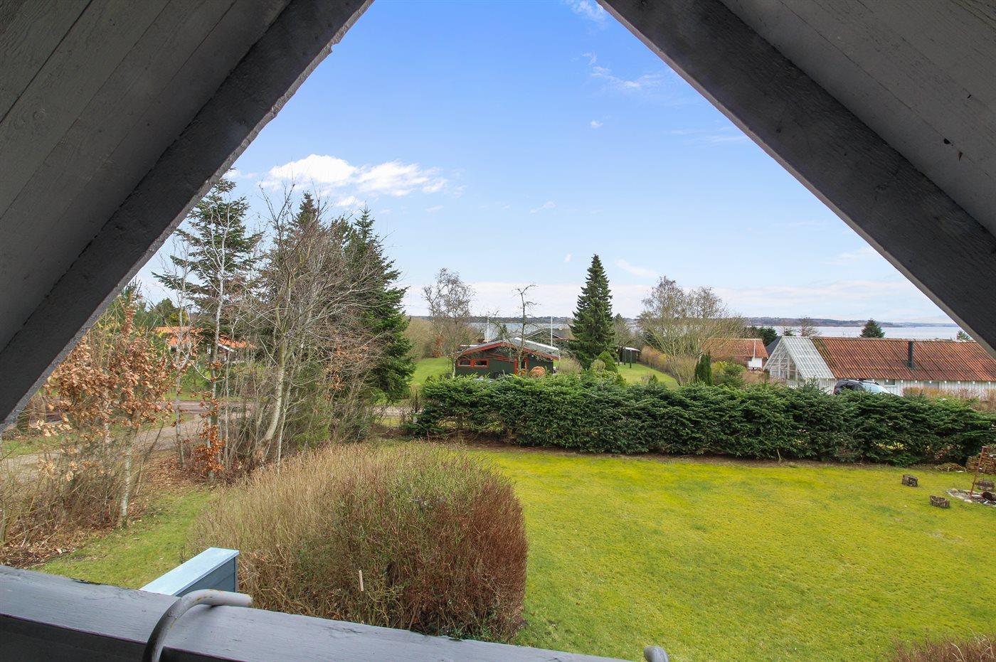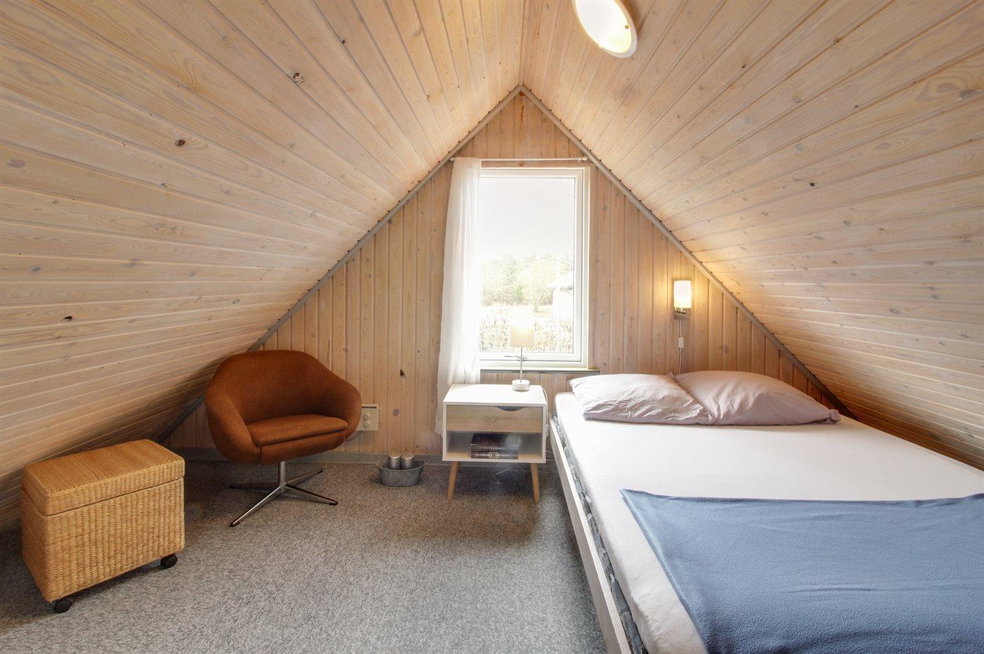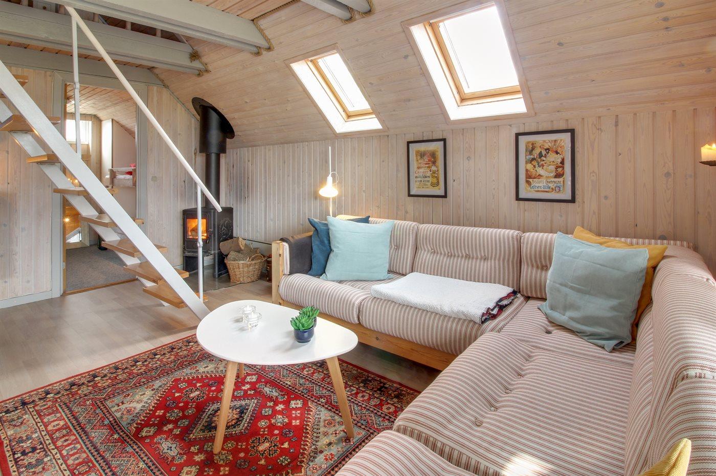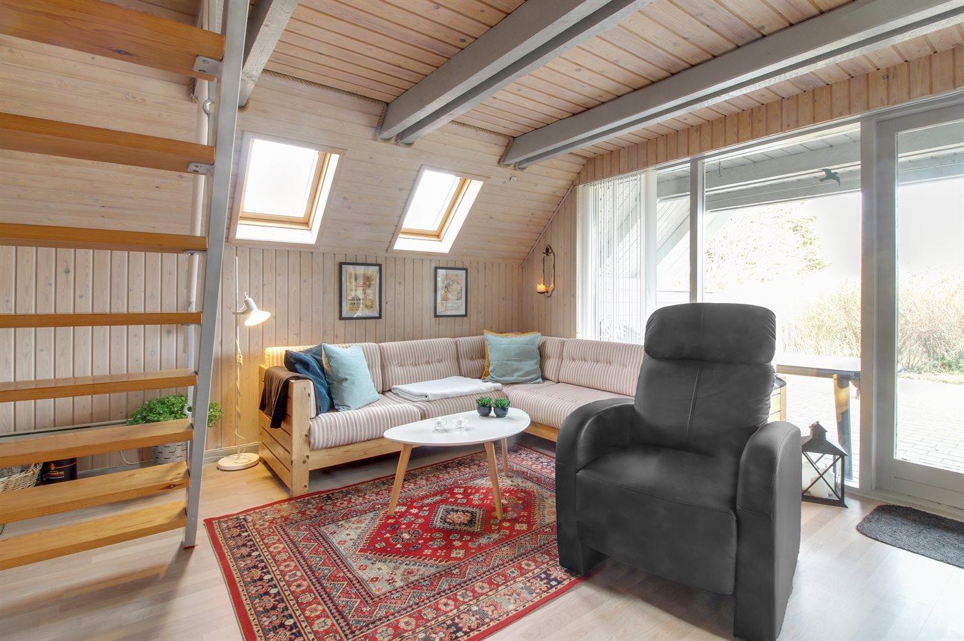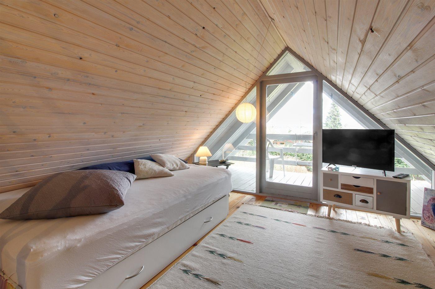 Dieses 2-stöckige Ferienhaus liegt auf einem leicht schrägenden Grundstück, das von Bäumen und Büschen umgeben ist, in einem ruhigen Gebiet dicht am Hjarbæk Fjord gelegen. Im Obergeschoss gibt es 1 Schlafzimmer mit Doppelbett und ein kleines Wohnzimmer.