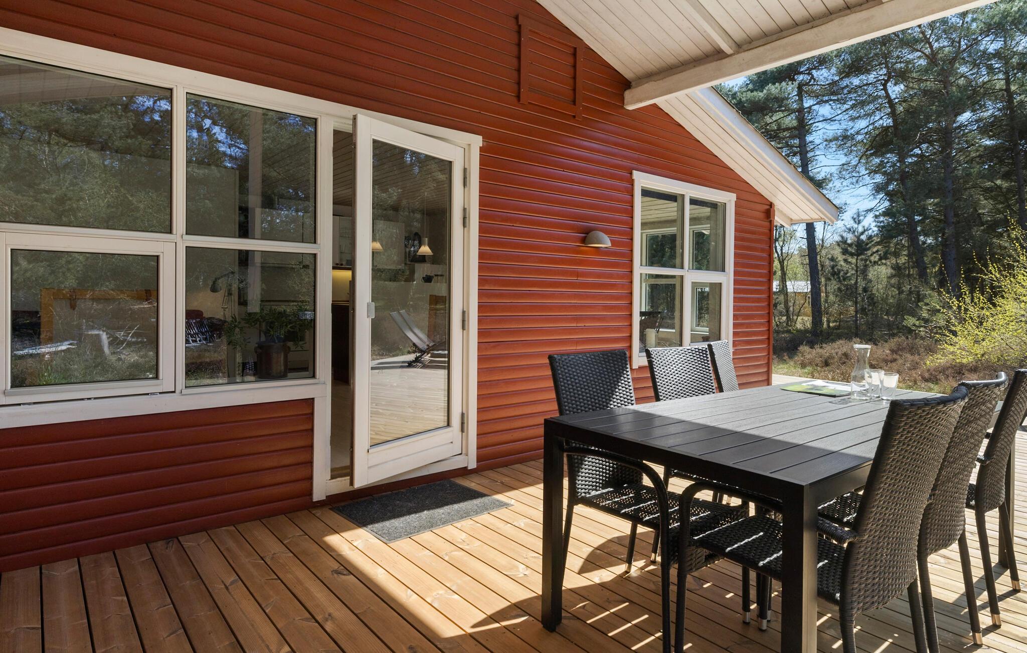 Vom Wohnzimmer aus hat man Zugang zu einer großen, teilüberdachten Holzterrasse mit Gartenmöbeln und einem Grill. Die Terrasse ist bestens geeignet zum Sonne tanken, zum Genießen der frischen Luft, zum Lesen eines guten Buches oder zum Genuss eines Ihrer Lieblingsgetränke. Auf dem umliegenden Naturgrundstück gibt es viel Platz für die Kinder zum Spielen und Toben; Die Kleinen werden die Schaukel und den Sandkasten ins Herz schließen.