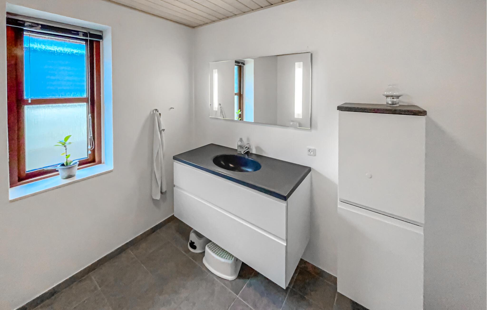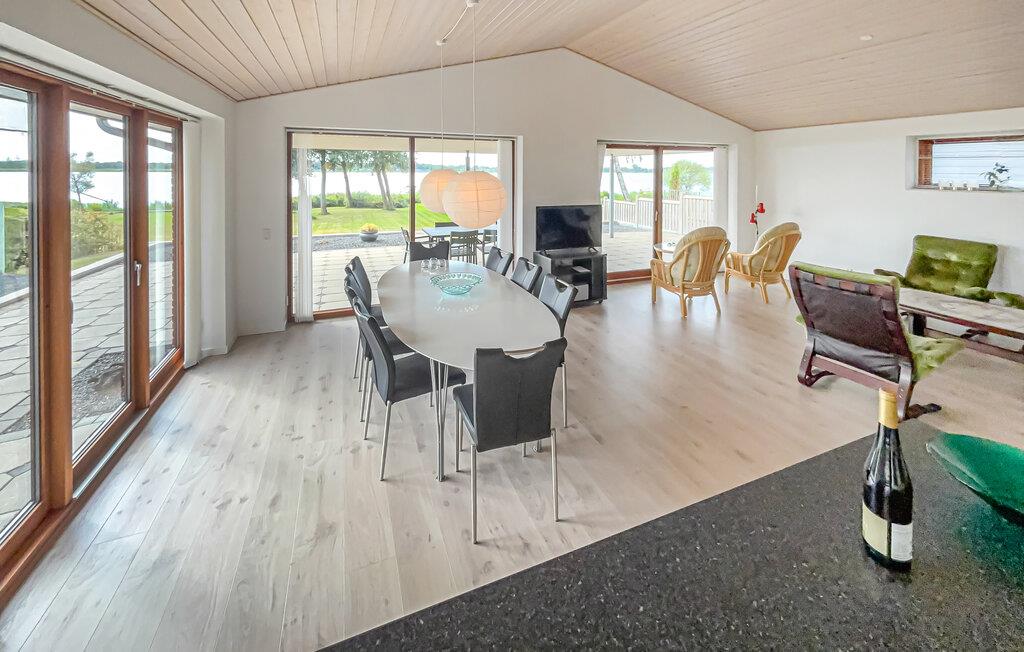 Erleben Sie erholsame Ferientage in diesem lichtdurchfluteten Haus, das Ihnen Ruhe, Komfort und eine herrliche Aussicht bietet. Ihr Ferienhaus liegt direkt am Sunds Sø und verbindet stilvolles Wohnen mit der einzigartigen Lage am Wasser. Betreten Sie den großzügigen Wohnbereich und genießen Sie die offene Raumgestaltung mit hohen Decken und großen Fenstern, die den Blick auf den See freigeben. Machen Sie es sich auf dem Sofa oder den Sesseln gemütlich oder genießen Sie Ihre Mahlzeiten am langen Esstisch mit Aussicht auf die Natur. Die offene Küche ist modern ausgestattet und lädt zu gemeinsamen Kochmomenten ein.