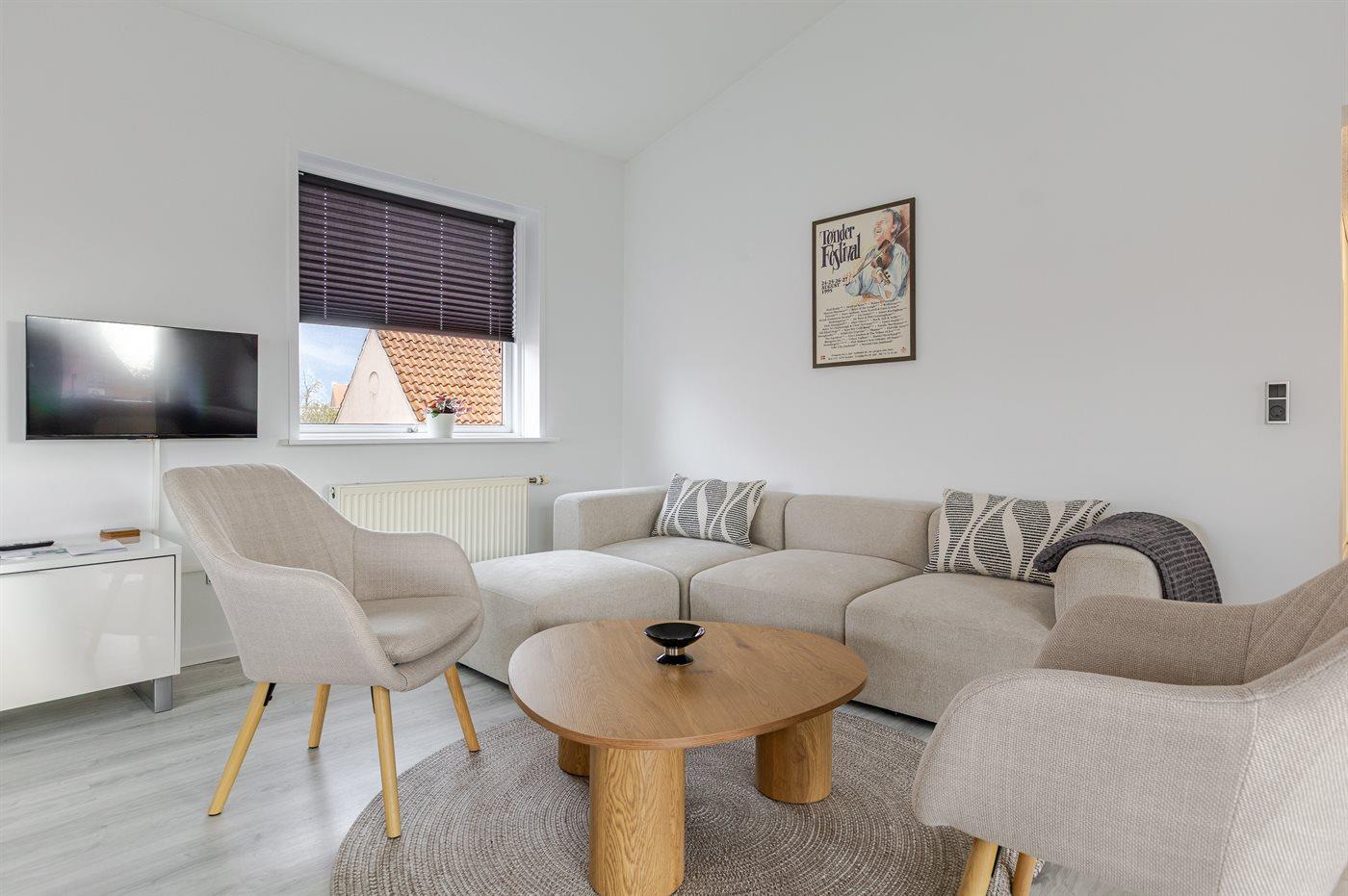 Gemütliche Ferienwohnung im Zentrum von Tønder mit Balkon und moderner Ausstattung, ideal für Familien und Haustiere.
