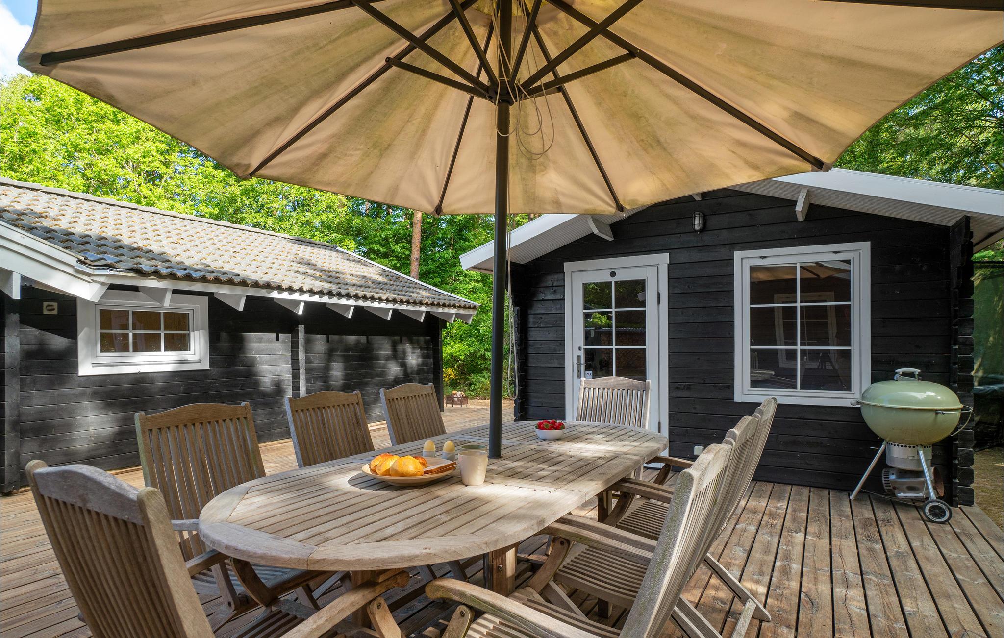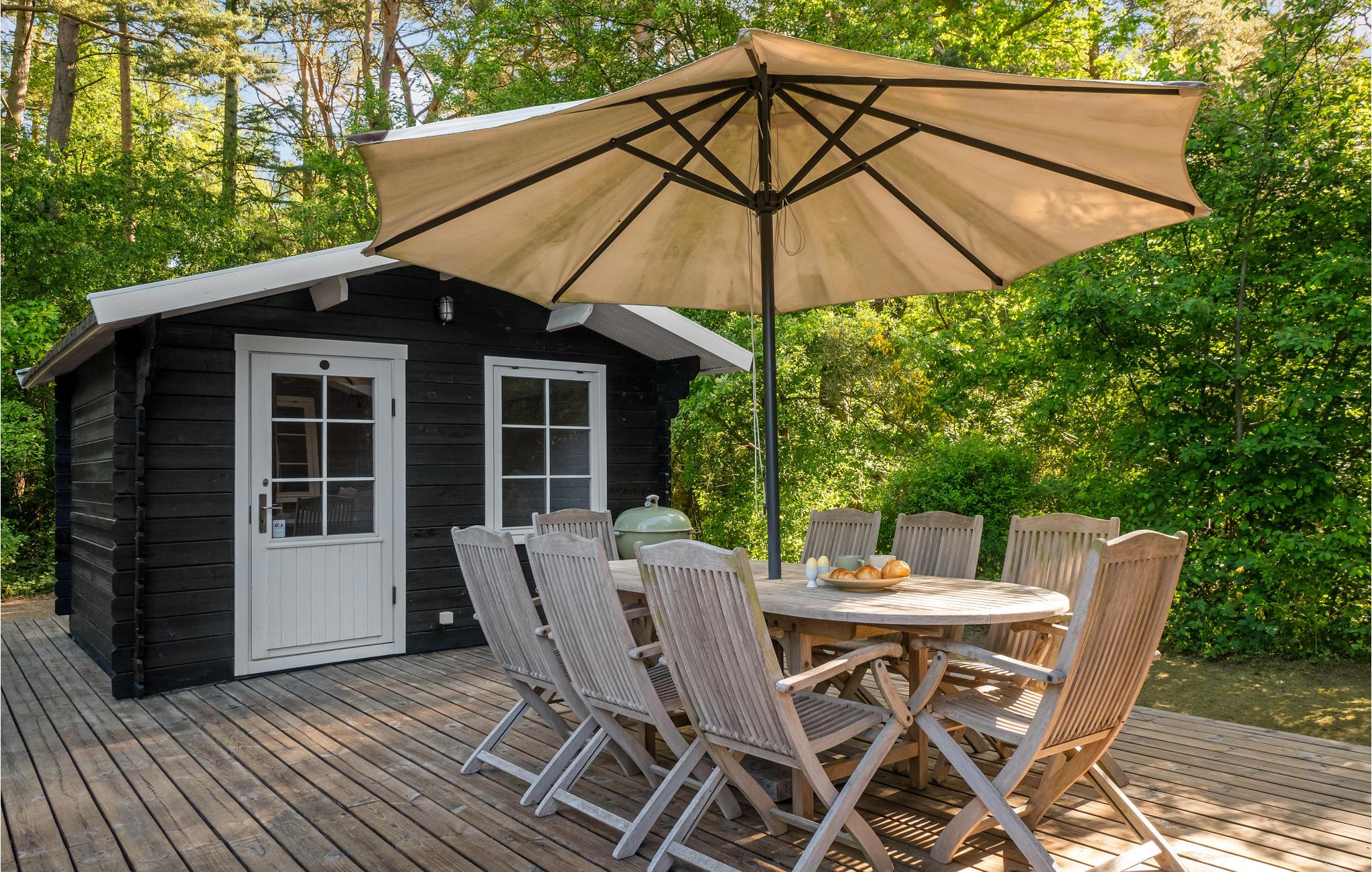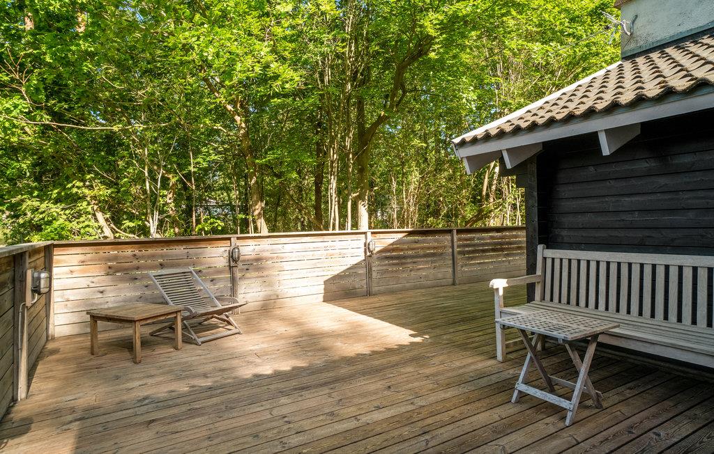 Das Haus umgibt eine große Holzterrasse, die auch das Nebengebäude mit dem Haupthaus verbindet. Kommen Sie hier zum Grillen und Relaxen im Schatten der Bäume zusammen und schmieden Pläne für Ihre anstehenden Urlaubstage. Anschließend können Ihre Kinder im Garten spielen oder Sie versammeln sich um die Feuerschale.