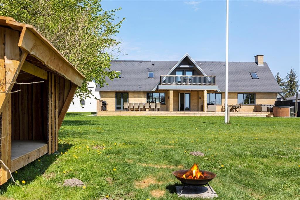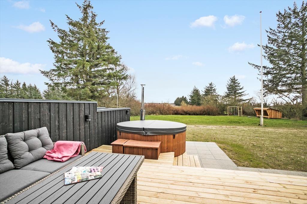 Der Wohnraum bietet Zugang zum Garten und auf die große, nach Süden gerichtete und teilweise überdachte Terrasse. Bei schönem Wetter können Sie auf der Terrasse die Mahlzeiten genießen und ein gutes Essen auf dem Grill und in der Außenküche zubereiten. In Verlängerung der Terrasse genießen Sie herrliche Stunden in der schwedischen Badetonne, die bei jedem Wetter erholsame Momente garantiert. Die Rasenfläche animiert Jung und Alt zu Ballspielen. Im Garten treffen Sie auf eine Schutzhütte zum Übernachten im Freien. Die jüngsten Urlauber dürfen sich auf eine Schaukel und eine Sandkiste freuen. Die anderen Gebäude auf dem Grundstück sind nicht Teil des Mietvertrages und daher während Ihres Aufenthalts verschlossen.