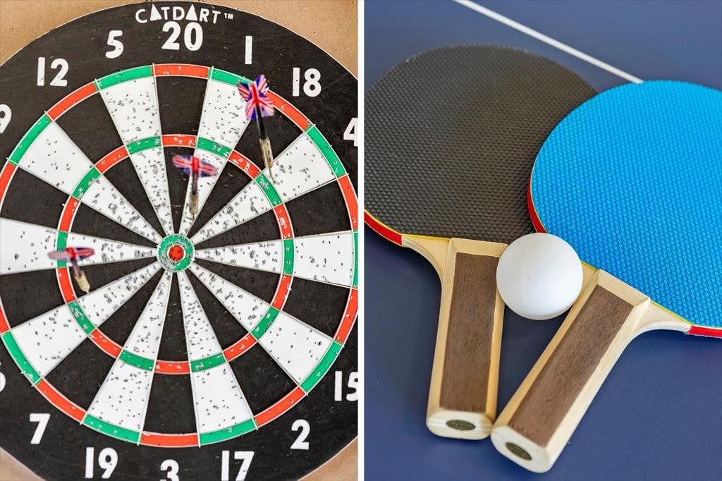 Aktivitätsraum : Rechts vom Wohnhaus wurde der doppelte Carport in einen Aktivitätsraum verwandelt, in dem sich Groß und Klein vergnügen können. Für Spaß und Unterhaltung sorgen eine Dartscheibe sowie ein kombinierter Tischtennis- und Billardtisch.