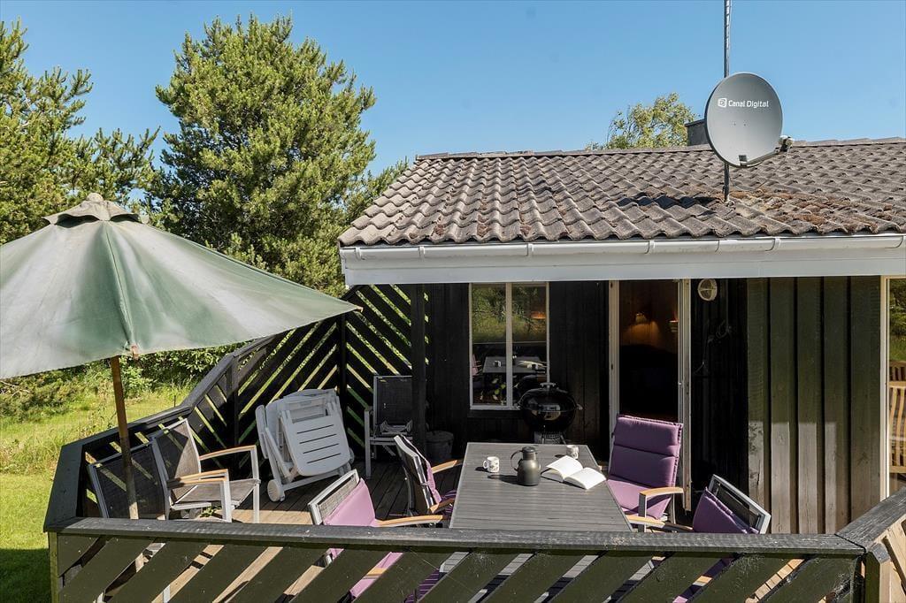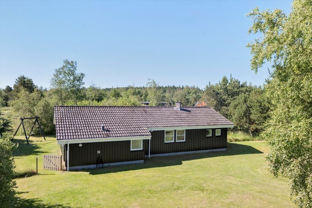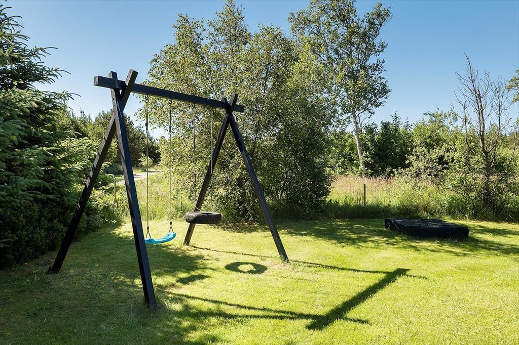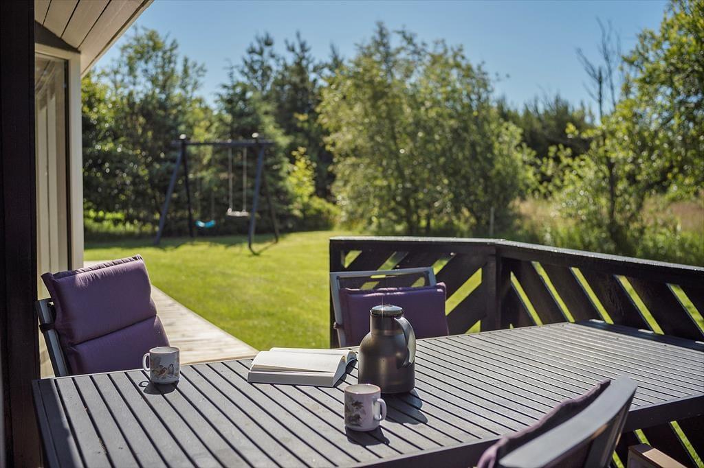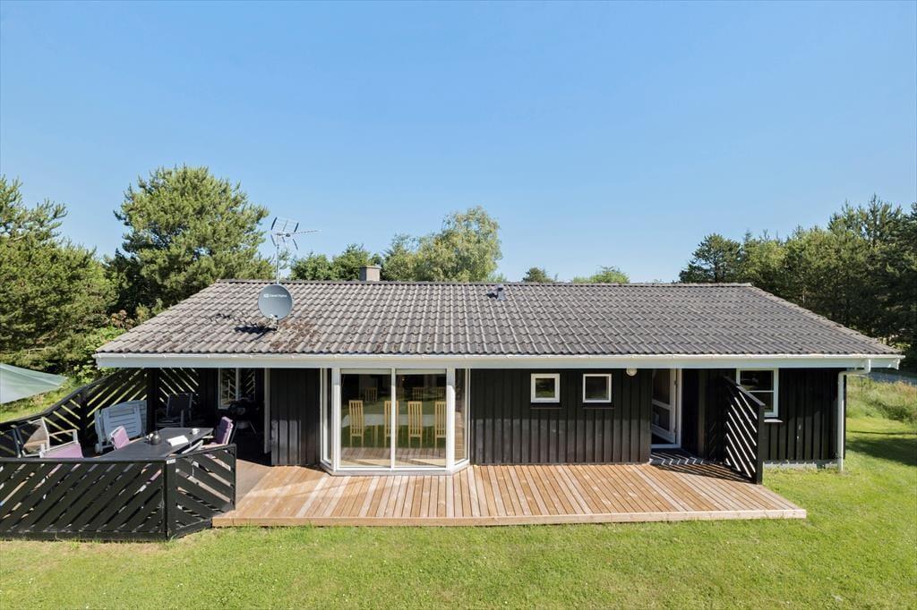 Das Ferienhaus liegt auf einem großen und komplett privaten Grundstück mit einer guten und engen Randbepflanzung, sodass Sie sich im Freien ungestört aufhalten können. Für Kinder sind Sandkasten und Schaukel sowie viel Platz zum Spielen mit oder ohne Ball auf dem Rasen vorhanden. Vom Eingangsbereich und Wohnzimmer wird die große Westterrasse betreten, die über einen überdachten Bereich in einer Ecke verfügt. Hier können Sie abends wunderbare Stunden mit einem Glas Wein oder einer heißen Tasse Kaffee verbringen. In diesem Haus ist der nach Süden ausgerichtete Teil des Gartens eingezäunt, was einen Urlaub mit Ihrem Hund, der frei mit der Familie herumlaufen kann, erleichtert.