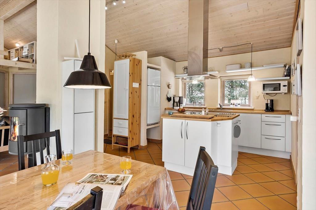 In einem so gut eingerichteten und soliden Haus wie diesem können Sie zu jeder Jahreszeit gelungene Urlaubstage verleben. Gemütliche Stunden im Hausinneren genießen Sie vor dem Kaminofen im Wohnraum, beim Lesen oder bei vergnügten Spielrunden am Esstisch. Die offene Küche bietet gute Arbeitsbedingungen. Ihre Kinder werden sich gern auf den offenen Schlafboden zurückziehen, um dort zu spielen. Vom hellen Wohnraum aus gelangen Sie in drei gute Schlafzimmer. Das Duschbadezimmer verwöhnt mit einer Fußbodenheizung. Gleiches gilt für den Aufenthalts- und den Eingangsbereich.