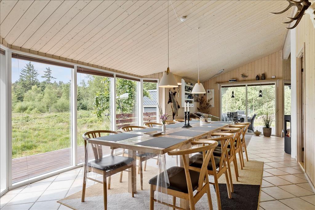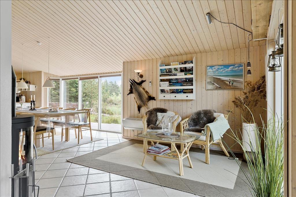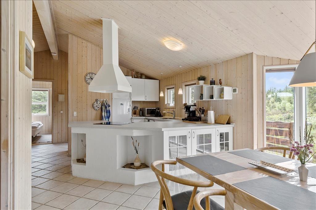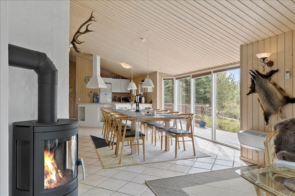 Dieses Ferienhaus gehört in unsere Luxuskategorie. Hier sind elektronische Großgeräte, hochwertige Möbel, moderne technische Ausstattung vorhanden und es wird Ihnen eine fantastische Lage mit tollem Ausblick geboten mit großen Chancen, Rotwild und andere Tiere zu beobachten, die draußen an dem Fenstern vorbei spazieren. Sieben Schlafplätze und zwei Badezimmer bieten genügend Platz für eine große Familie. Ein Badezimmer ist mit Whirlpool und Sauna sowie mit Waschmaschine und Trockner ausgestattet. Küche, Esszimmer und Wohnzimmer ergeben zusammen einen großen offenen Raum mit einem Kamin, der in den kalten Morgen- und Abendstunden Wärme und Gemütlichkeit verbreitet. Ein wunderbares Haus mit einer gelungenen Kombination aus Gemütlichkeit, Komfort und Luxus!