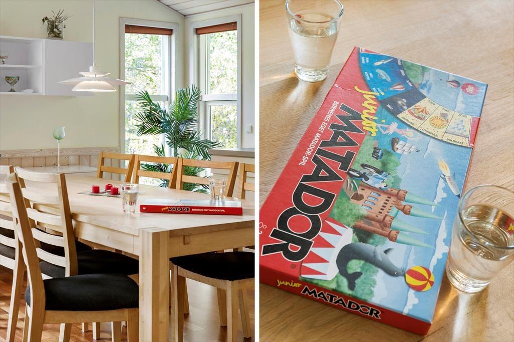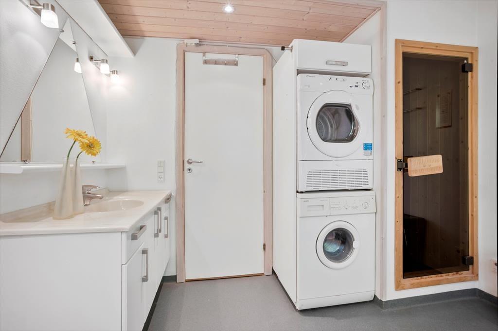 Das 86 m² große Hausinnere umfasst unter anderem drei gute Schlafräume und ein Badezimmer, in dem eine Dusche, eine Fußbodenheizung, ein Wäscheturm und eine Sauna bereit stehen. Die weiße Küche mit glatten Schrankoberfächen ist ausgestattet mit Geschirrspüler und einen hoch eingebauten Backofen. Der Esstisch ist direkt neben der Küche platziert, sodass Sie selbst während der Zubereitung der Mahlzeiten die Nähe Ihrer am Tisch spielenden Familienmitglieder genießen. Das fertige Essen servieren Sie am Esstisch oder auf der angrenzenden Terrasse. Der Wohnraum schließt offen an die Küche. Er ist genauso hell und stilvoll eingerichtet wie der Rest des Hauses.