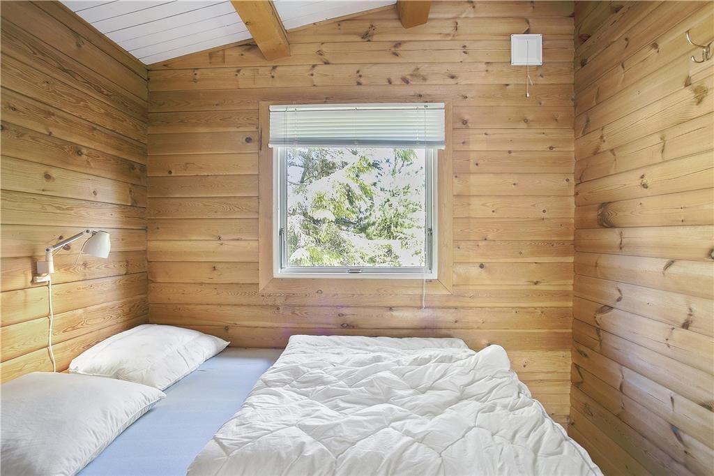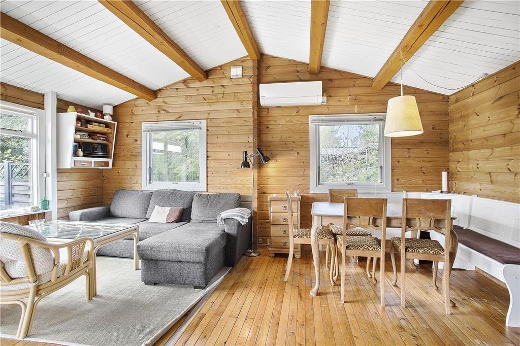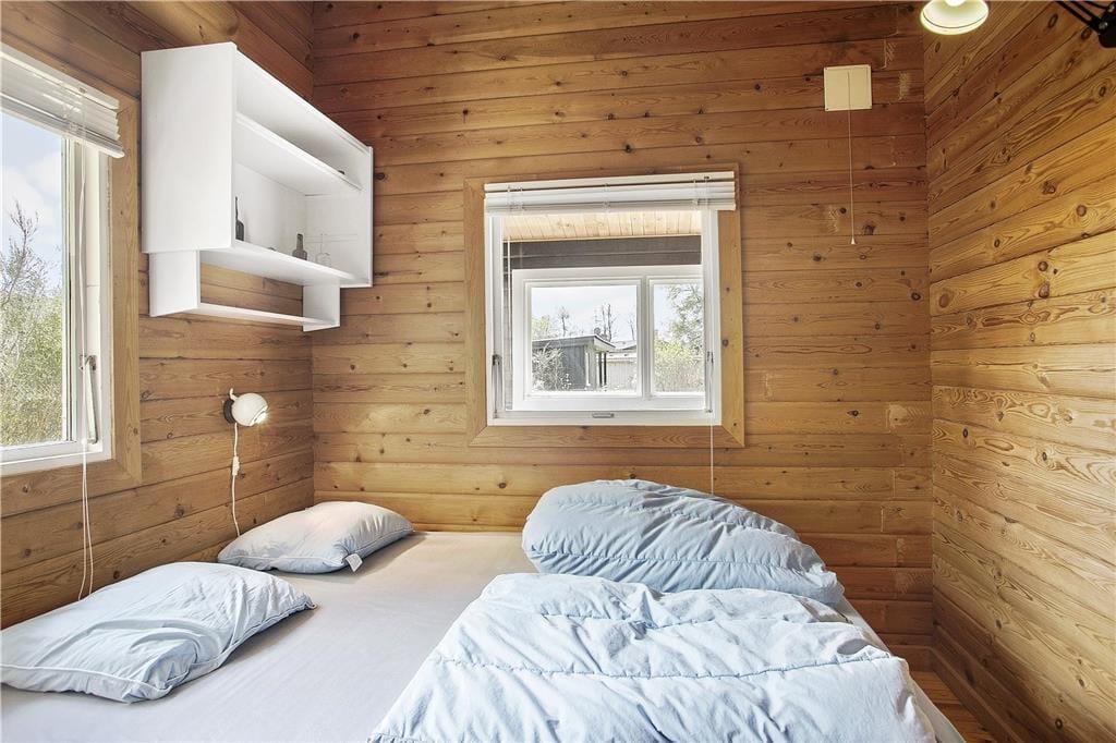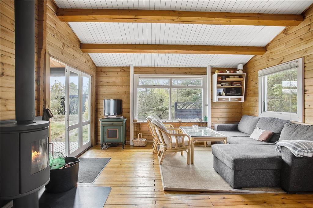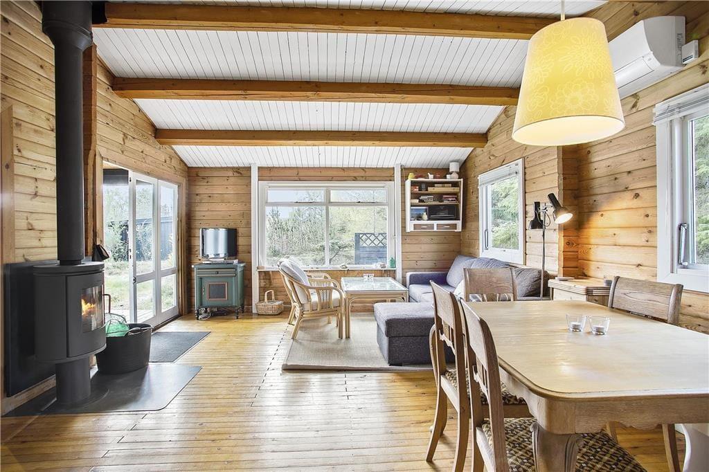 Trotz der wenigen Quadratmeter hat das Ferienhaus eine großzügige Raumaufteilung. Der Kamin steht zusammen mit gemütlichen und gepflegten Korbmöbeln im Wohnzimmer, und in der Ecke befindet sich eine Essecke mit Bank und Stühlen. Die Küche mit Ausgang zu einer überdachten Terrasse ist gut u. a. mit Geschirrspüler, Kühlschrank und Elektroherd ausgestattet - Sie werden keinen modernen Komfort vermissen. Das kleine Badezimmer ist mit Dusche und Waschbecken. Das Ferienhaus hat drei Schlafzimmer, wovon zwei mit jeweils einem Doppelbett und eins mit zwei Einzelbetten eingerichtet ist.