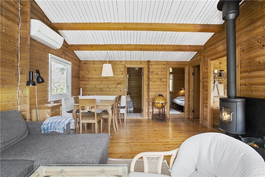 In dieses Ferienhaus verlieben Sie sich sofort. Ein kleines reizendes Holzhaus mit kleinen gemütlichen Räumen und einem zentralen Kamin, der in alle Ecken Wärme bringt.