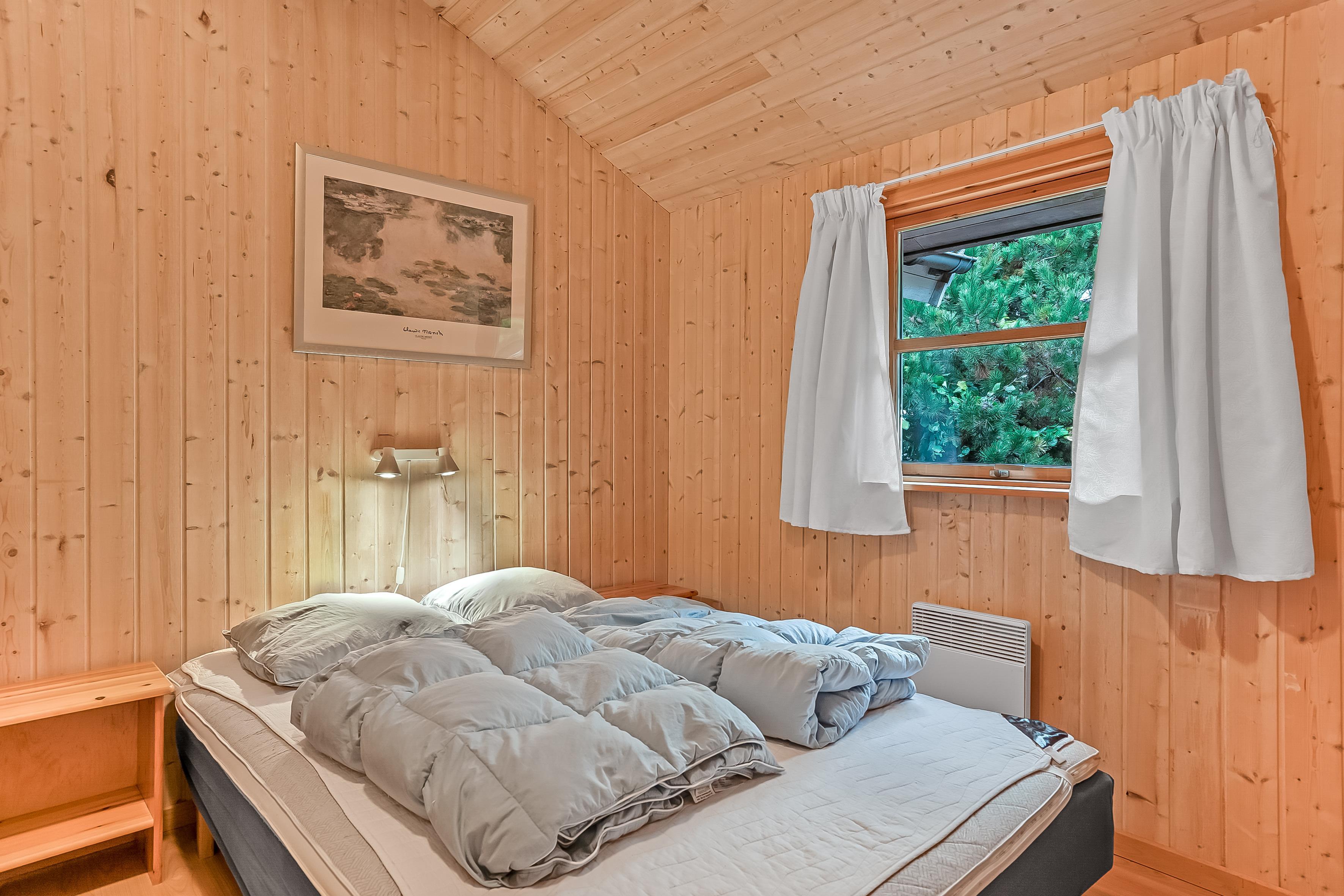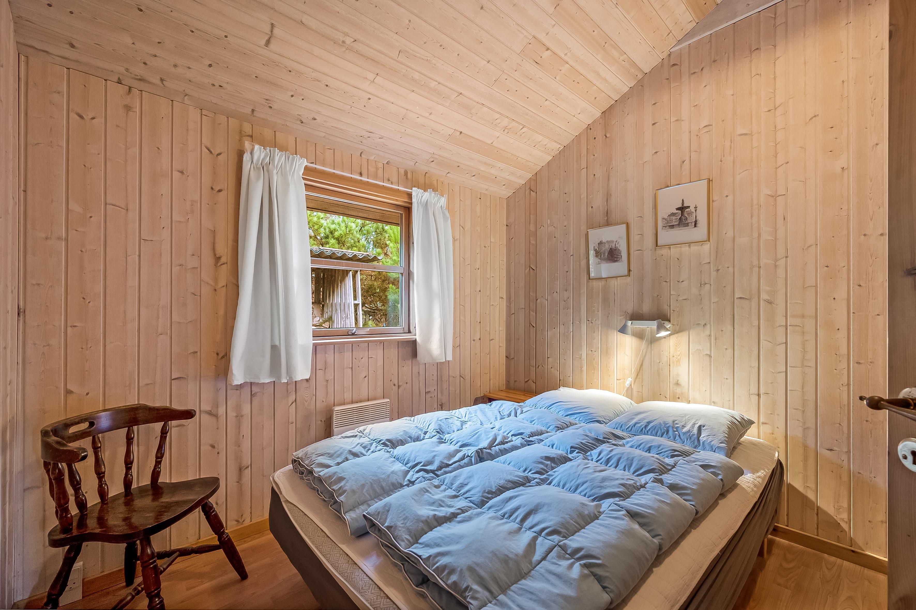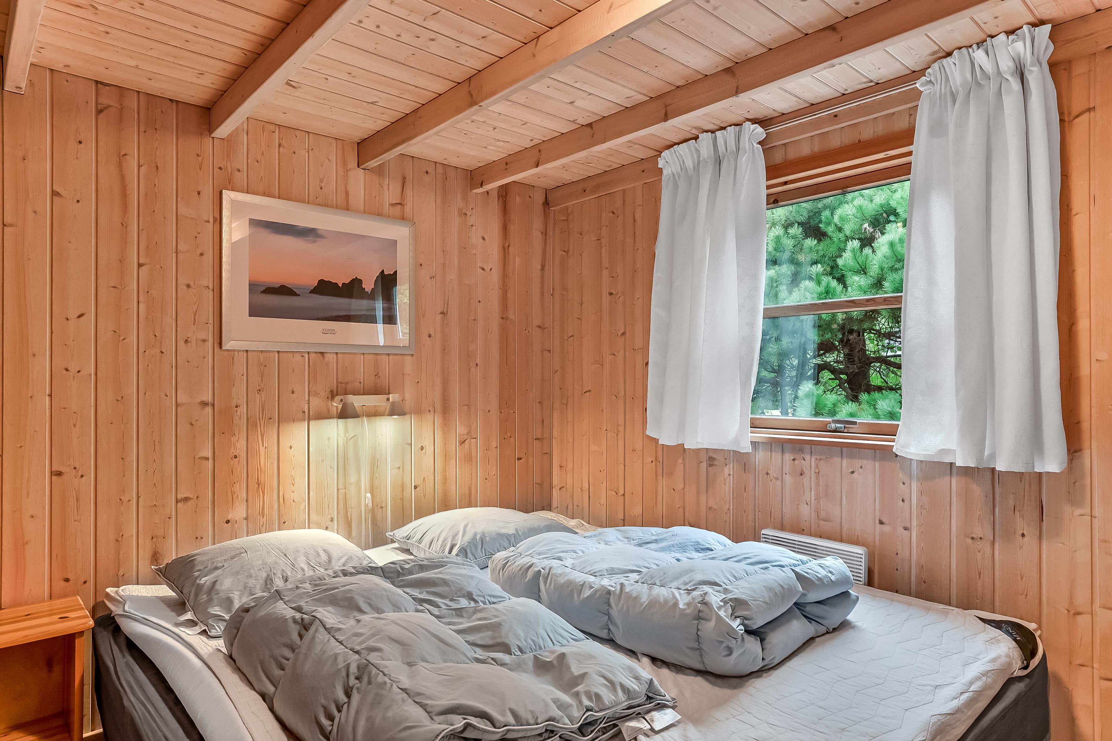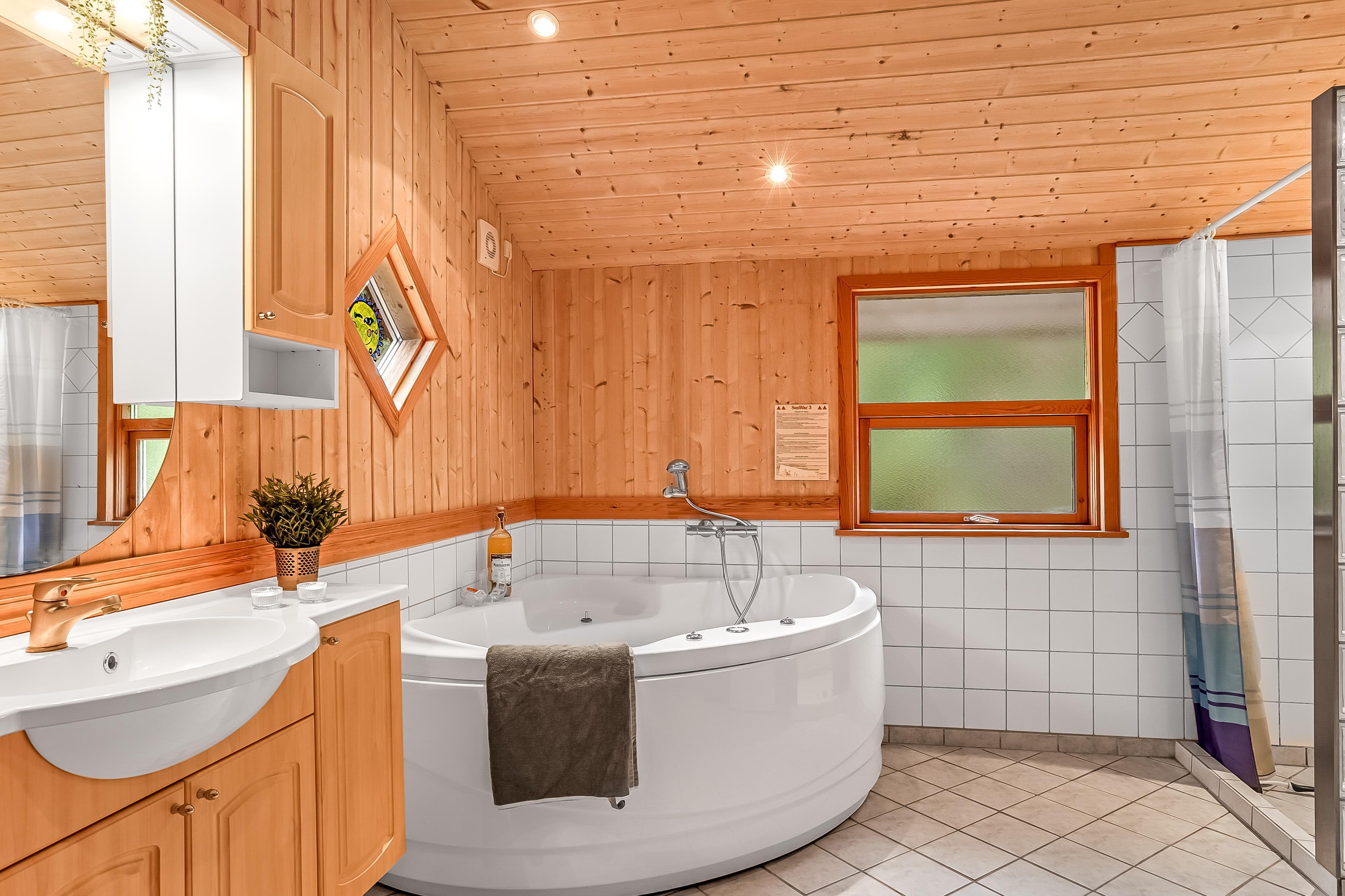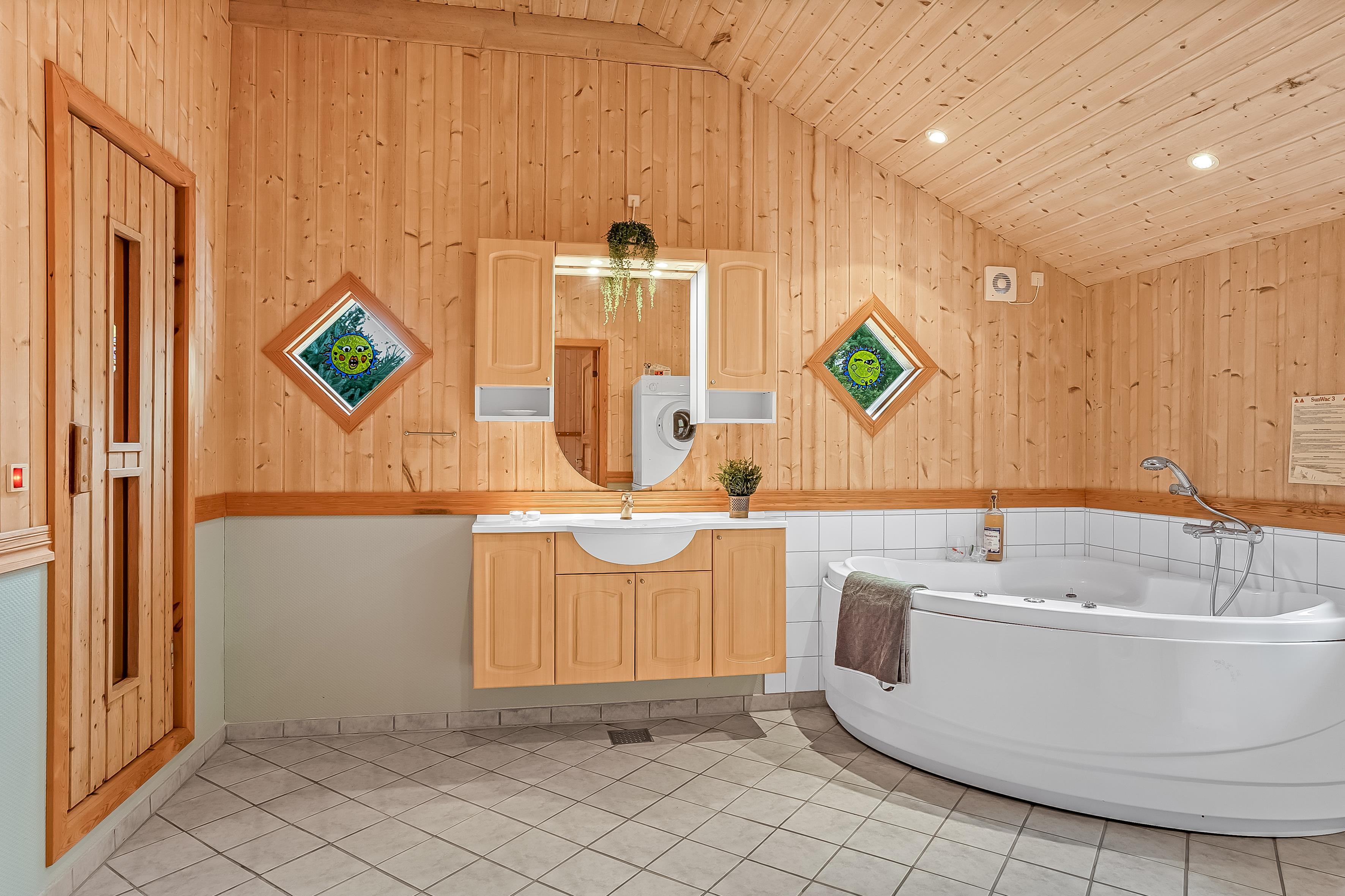 Die Schlafplätze verteilen sich auf 4 Schlafzimmer mit Doppelbetten sowie eine Schlafempore mit Platz für 4 Personen auf Matratzen – perfekt für Kinder oder zusätzliche Gäste. Das Ferienhaus verfügt über zwei Badezimmer; das größere bietet Fußbodenheizung, eine Duschkabine, einen luxuriösen 2-Personen-Whirlpool und direkten Zugang zur Sauna, während das kleinere Badezimmer ebenfalls Fußbodenheizung und eine Duschkabine hat.