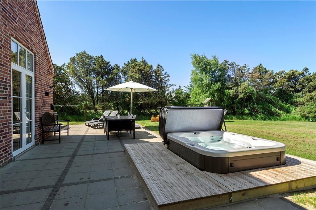 Das Grundstück ist sehr schön angelegt, mit einem großen Parkplatz vor dem Haus, einer noch größeren Rasenfläche und einer tollen 125 m² großen Terrasse. Ein Teil der Terrasse ist überdacht, und als ein zusätzliches Detail erwartet dich ein großer Außen-Whirlpool, in dem du dich so richtig unter freiem Himmel entspannen kannst.