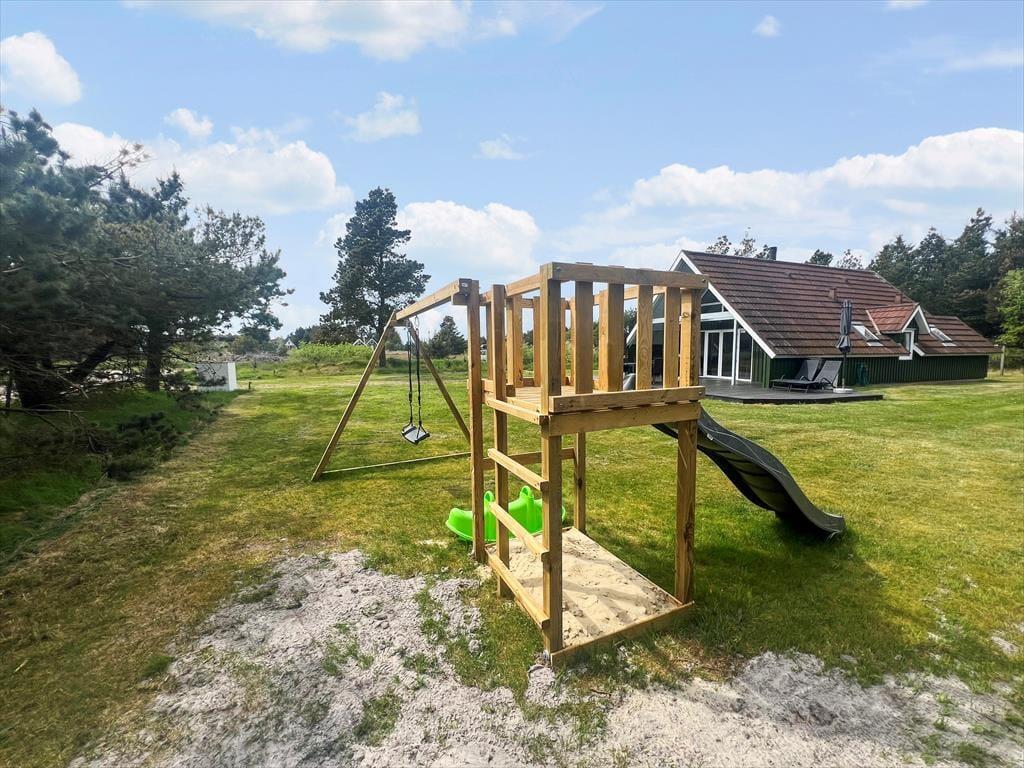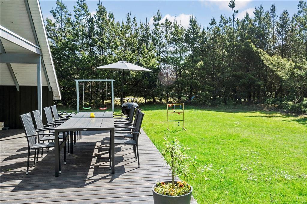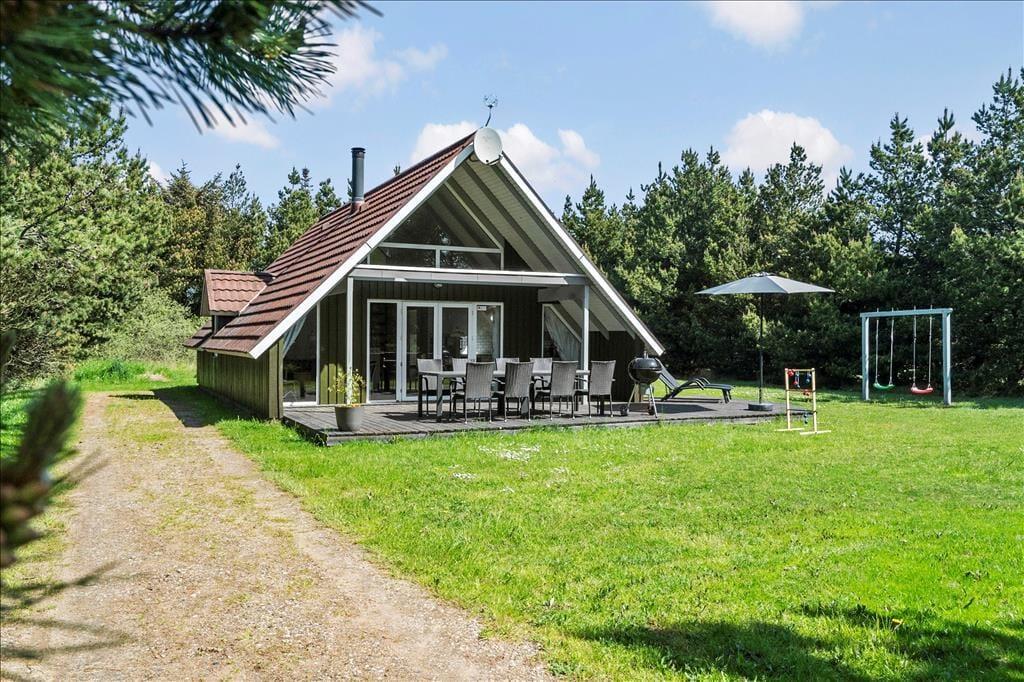 Das Ferienhaus liegt auf einem 1.500 m² großen Grundstück, das von allen Seiten von Tannen umgeben ist. Darum kannst du dich draußen ganz frei bewegen, ganz gleich, ob du dich auf der teilweise überdachten Südterrasse sonnst, Fußball spielst, schaukelst oder auf dem Rasen Purzelbäume schlägst.